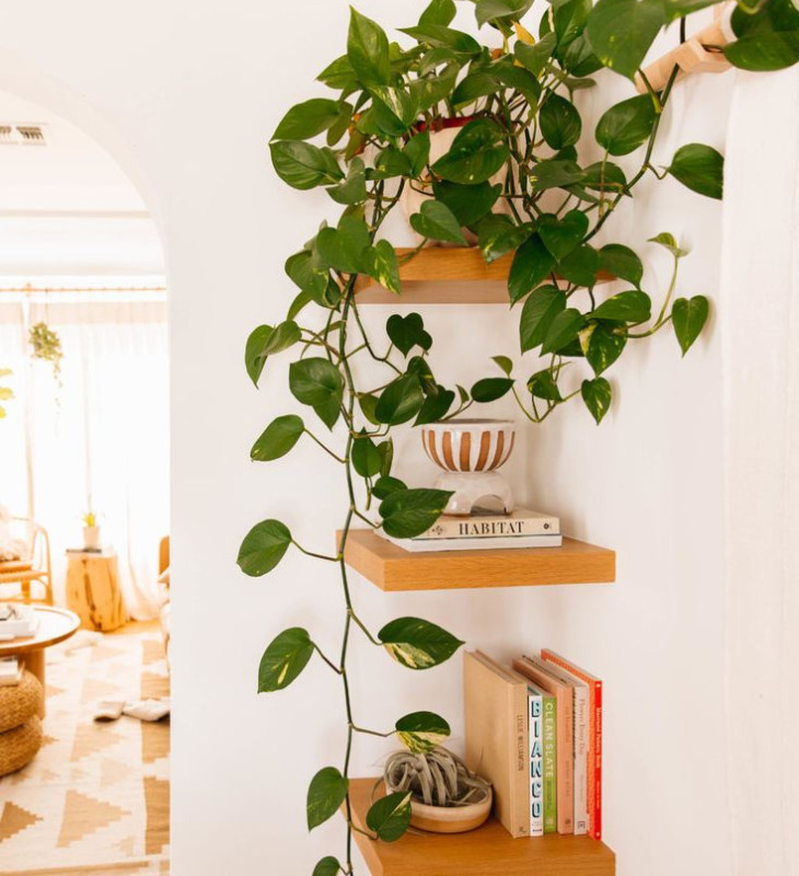 Et si on optimisait l’espace dans les airs ? Le Pothos est une liane aux racines aériennes. Cela signifie que vous pouvez le faire pousser en plante grimpante, soit en plante retombante. Tout dépend du style que vous souhaitez donner à votre cuisine !