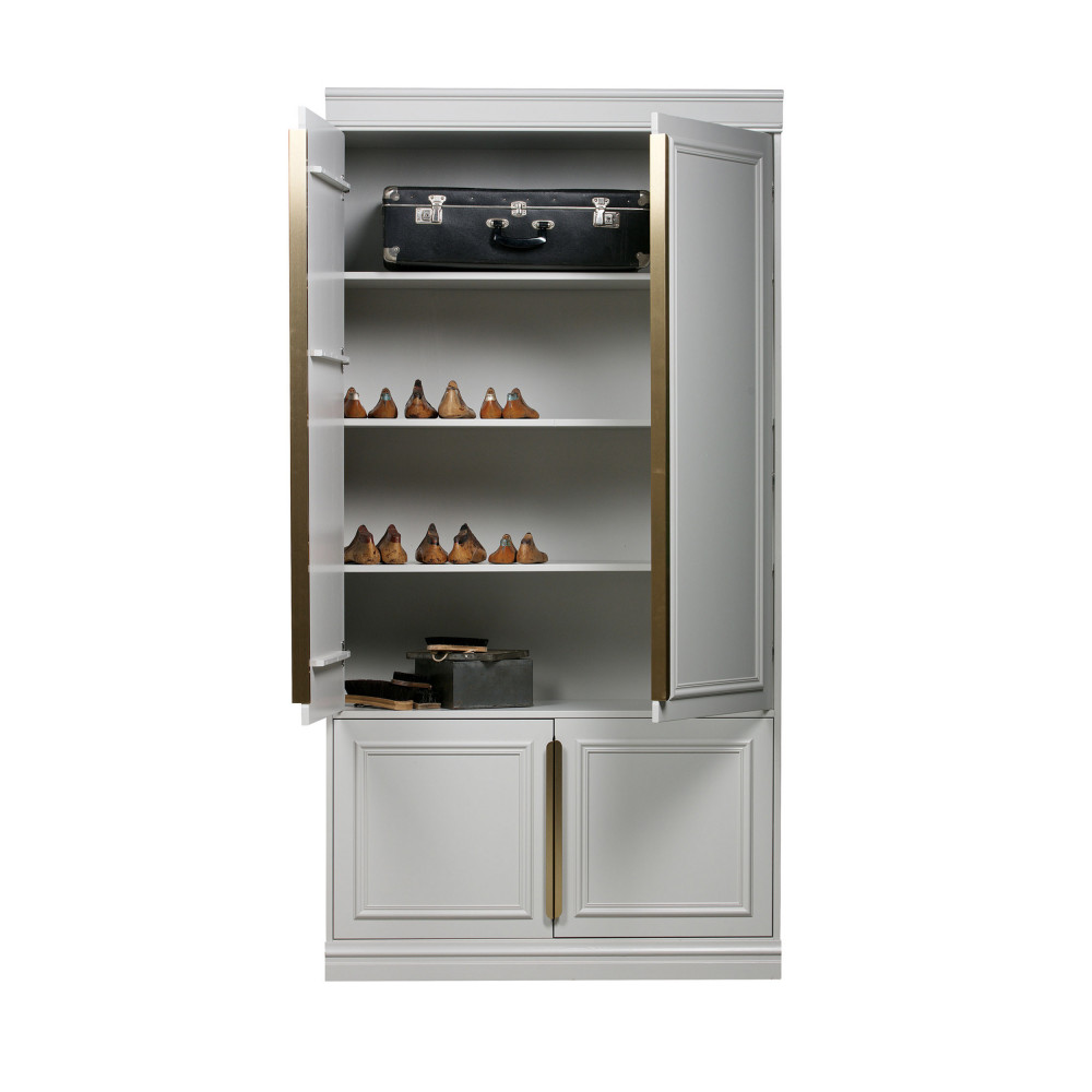 Style d’inspiration classique et esprit moderne se mêlent dans la conception de cette pièce à l’allure distinguée et hors du commun. L’Armoire en pin Organize, signée Woood, s’offre un design ultra soigné pour séduire les férus d’ambiances à la fois sophistiquée et authentique. Cette armoire en bois massif se différencie par sa teinte gris nuage qui est agrémentée d’une touche de couleur dorée très classe, notamment au niveau de ses poignées. Ses proportions bien équilibrées et sa profondeur de 44 cm en font un meuble très pratique. Derrière ses quatre portes se trouvent trois étagères en haut et une en bas pour le rangement de vos accessoires et effets divers.