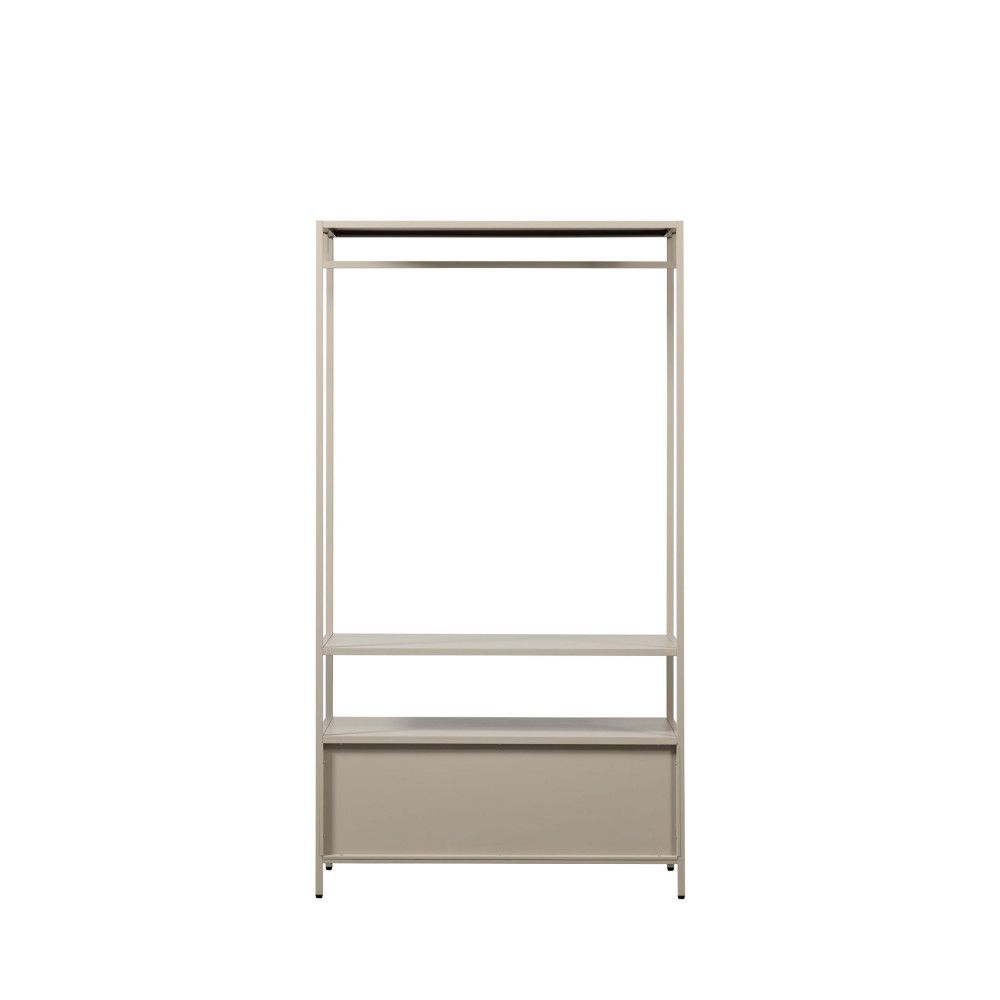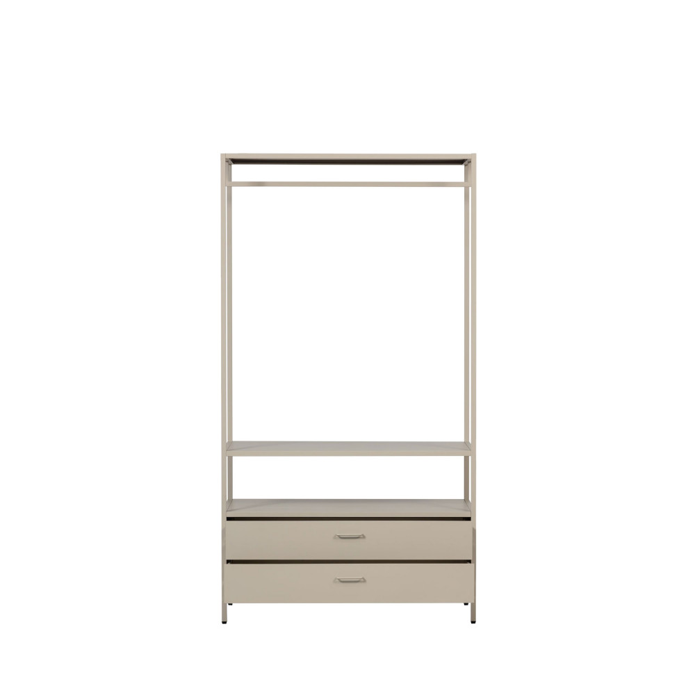 L’armoire ouverte Ferris en version large allie praticité et design industriel. Conçue par Woood, elle se compose d’une structure en métal avec une barre de penderie, de 2 tiroirs et d’une étagère ouverte, parfaite pour associer rangement et décoration.