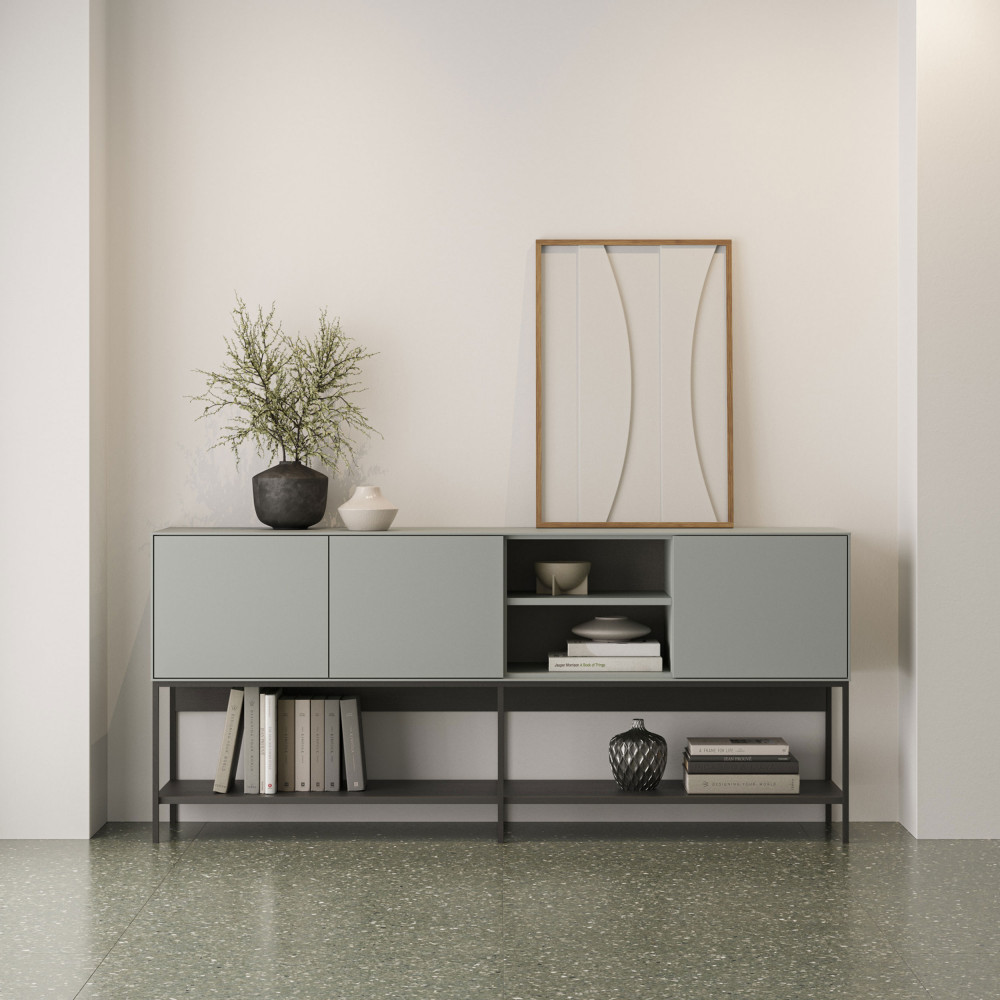 Ce buffet à la forme rectangulaire se compose d'un bel espace de rangement fermé par 3 portes de type "push to open", complété par 2 niches ouvertes. Il est également pourvu d'une grande étagère en partie basse.