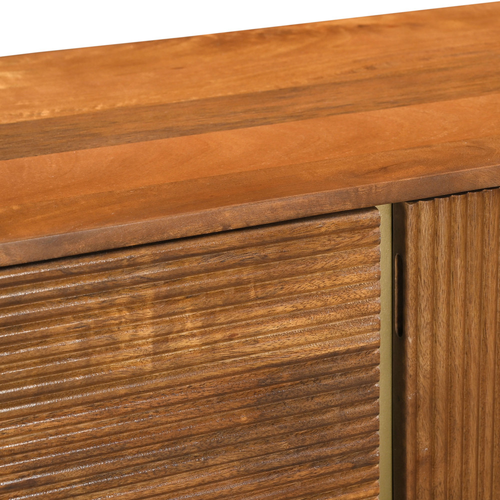 Ce buffet design offre un bel espace de rangement fermé par 3 portes battantes. Ces dernières sont entièrement striées, une finition élégante. Vous remarquerez que la porte du milieu est striée en sens inverse, pour jouer sur les lignes et apporter du dynamisme. Sympa, n'est-ce pas ?