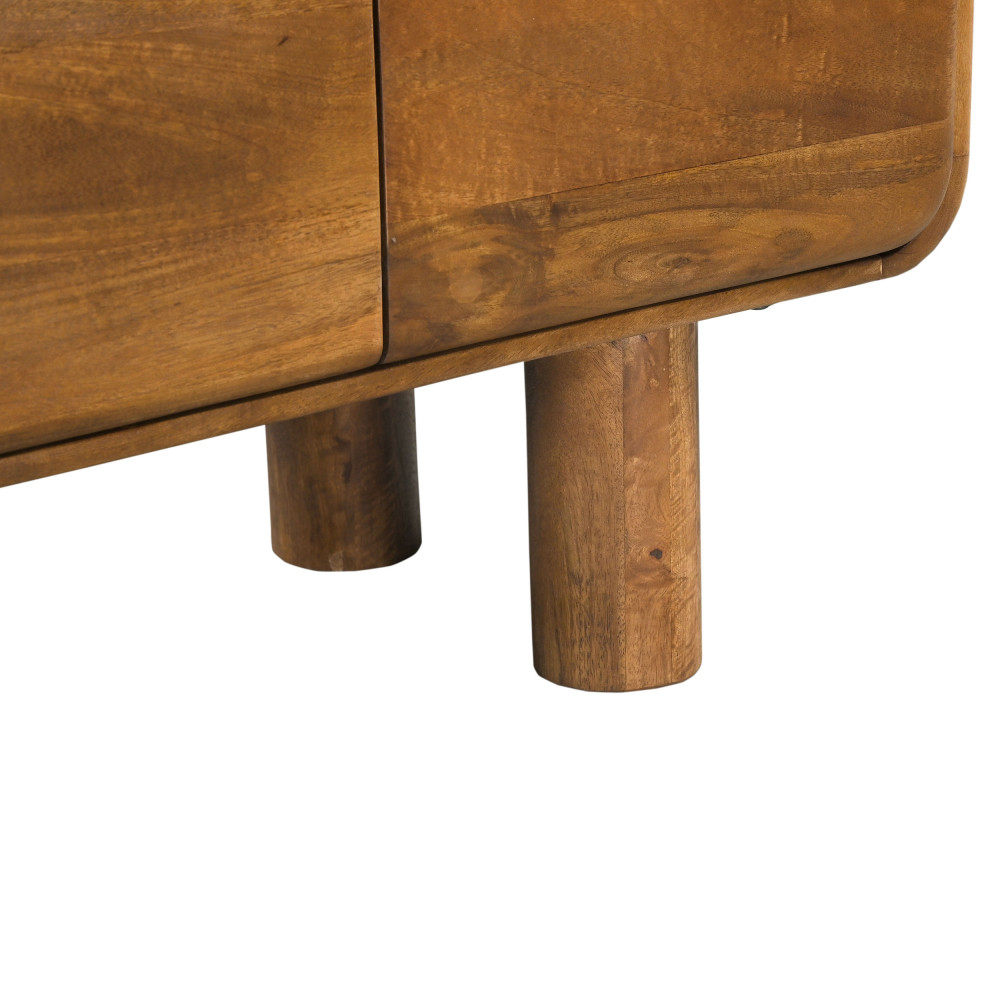 Ce buffet bas affiche un style un peu vintage, toujours apprécié. C'est un modèle qui a du caractère tout en étant très sobre et plutôt minimaliste, ce qui le fera également matcher avec une déco contemporaine. Côté design, il présente une forme rectangulaire avec des bords arrondis pour plus de douceur. Il est également pourvu de 4 gros pieds cylindriques bien stables de 20 cm de haut.