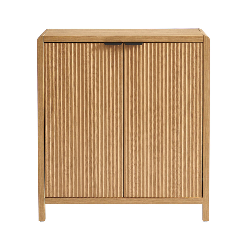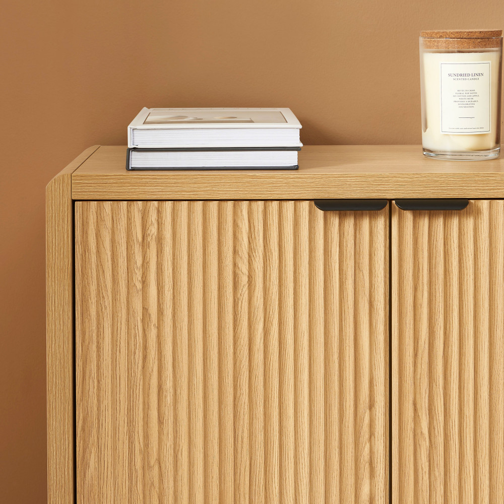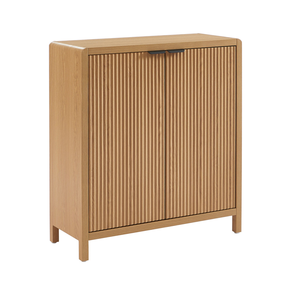 Derrière ses 2 portes, le buffet Paula dévoile 5 compartiments spacieux avec tablettes, idéaux pour organiser vaisselle, linge de maison ou objets du quotidien.