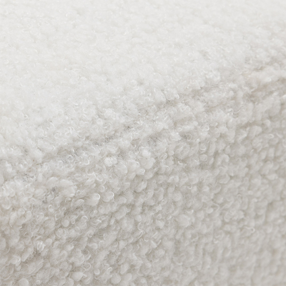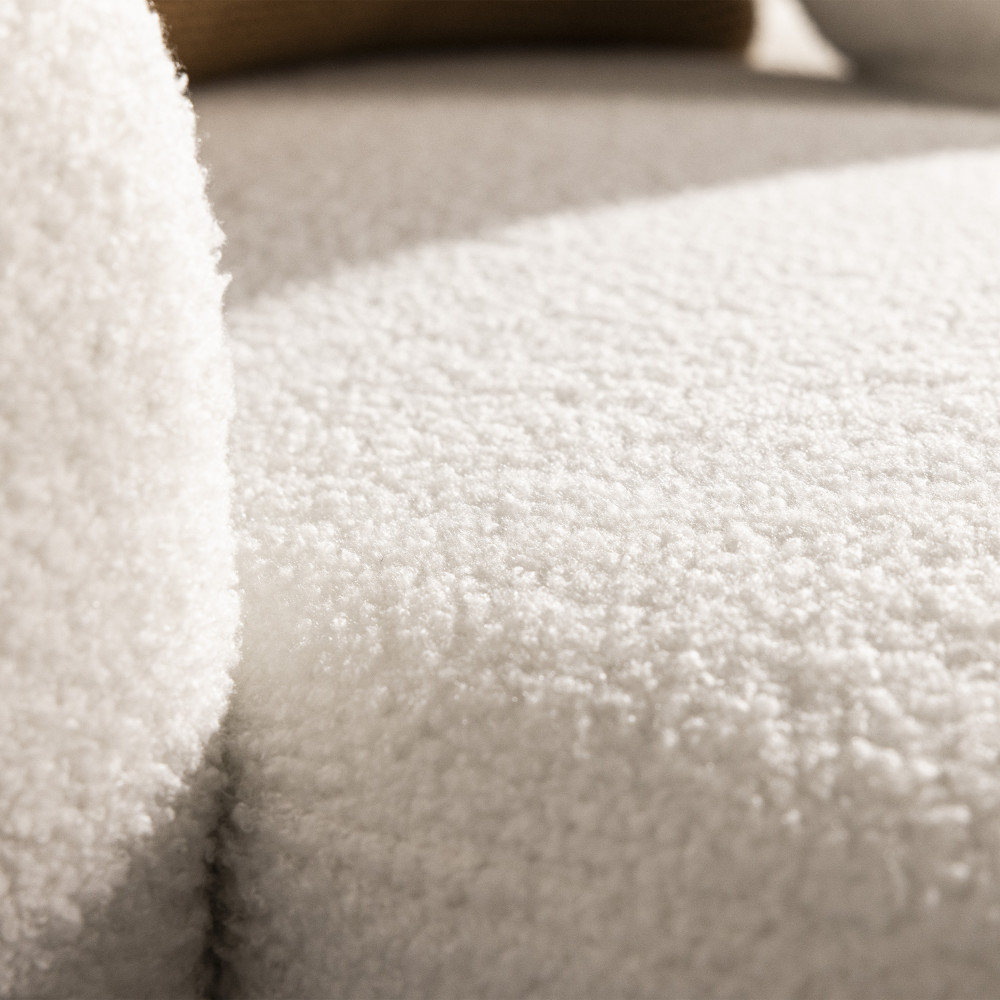 Vous êtes fan de l'effet peau de mouton ? Ça tombe bien ! Son revêtement est entièrement composé de tissu bouclette, une matière qui se marie parfaitement avec son piètement droit en bois clair.