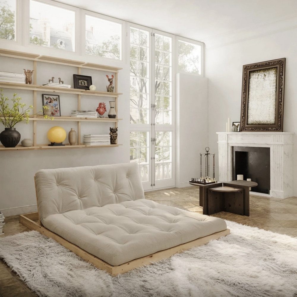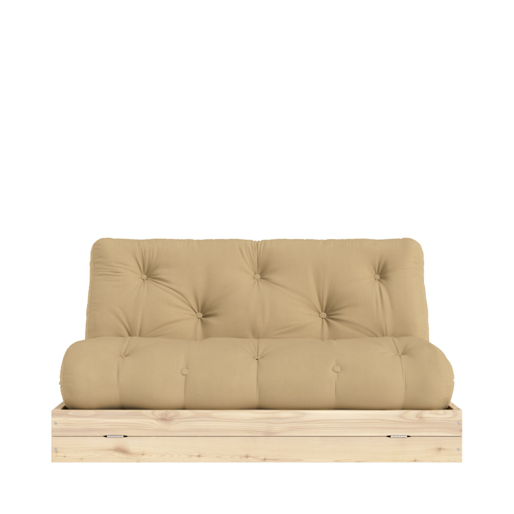 Ce modèle repose sur une structure en bois robuste associée à une assise rembourrée confortable, conçue pour un usage régulier. Grâce à son mécanisme futon convertible, il se transforme aisément en couchage d’appoint, une solution idéale pour recevoir sans contrainte. Ses lignes sobres et bien proportionnées lui confèrent un style facile à intégrer.