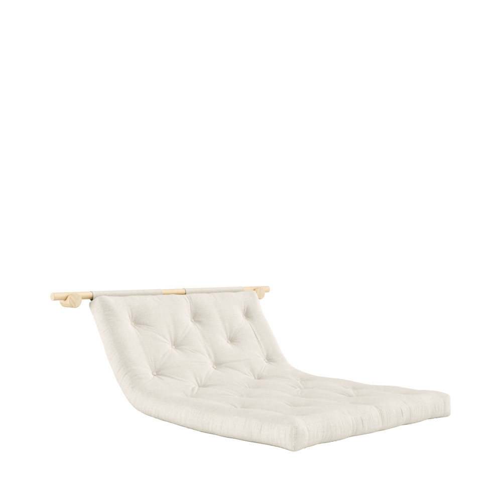 Son système de quatre points d’ancrage muraux garantit sécurité et stabilité en position suspendue. Une fois au sol, il devient un canapé confortable de 2,5 places, puis se transforme en lit 135 x 200 cm grâce à son futon en lin à dérouler. Fourni avec deux jeux de supports, Hooked peut être installé dans deux espaces différents, pour une flexibilité maximale au quotidien.