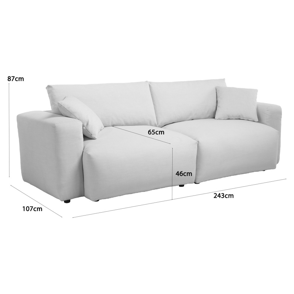 - Ses dimensions sont de : 87 cm en hauteur, 243 cm en largeur et 107 cm de profondeur, avec une assise de 46 cm de haut et 65 cm de profondeur