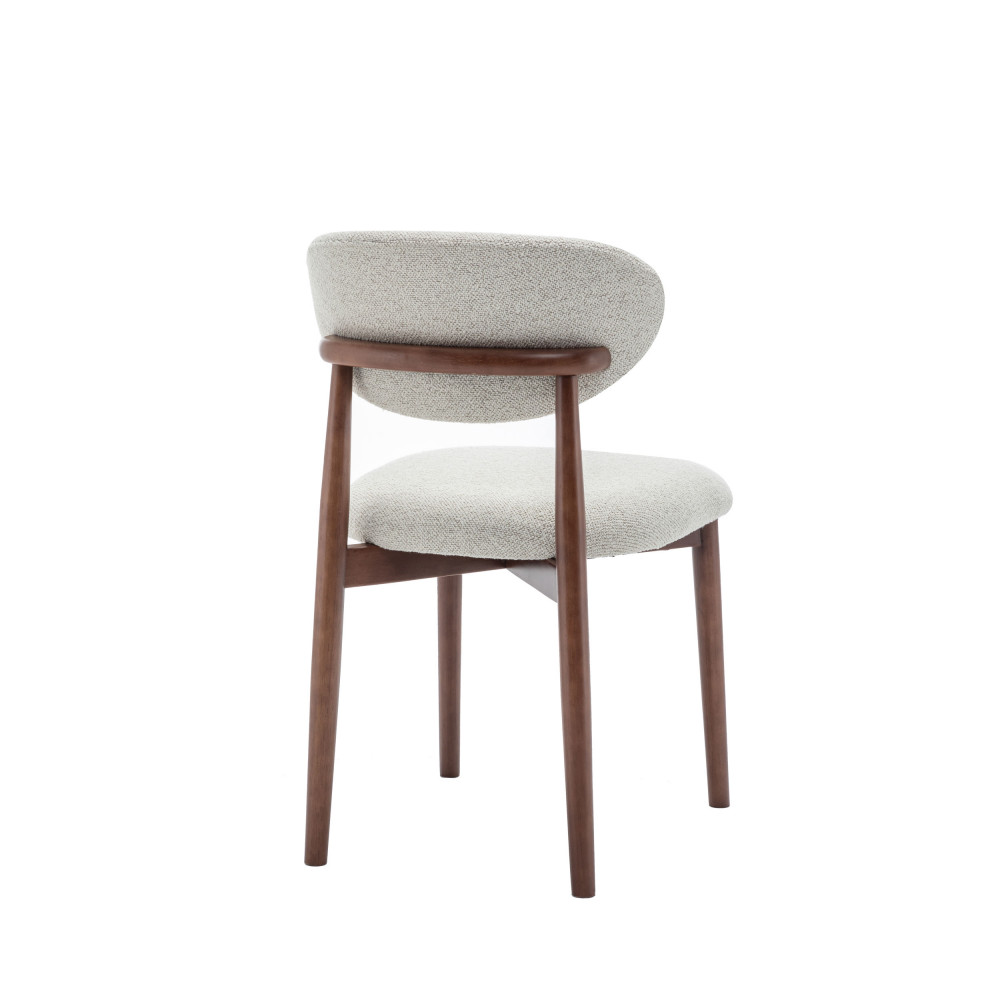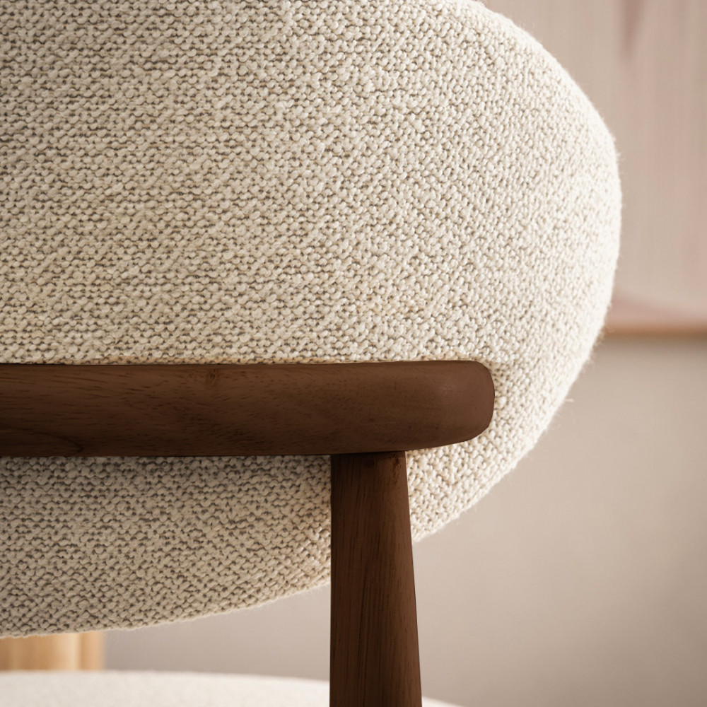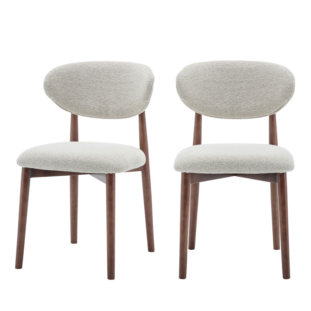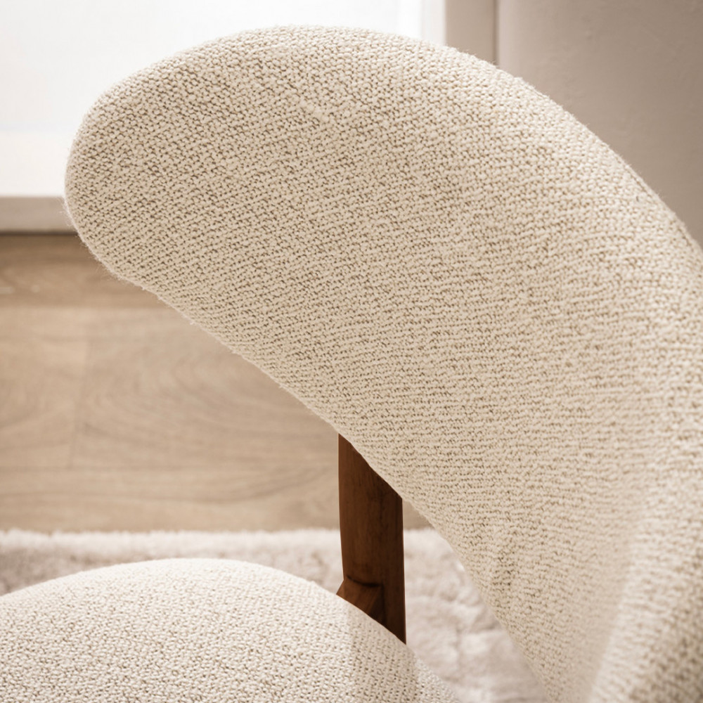 Ces chaises conjuguent parfaitement confort et style. Leur revêtement en tissu bouclette, doux et texturé, crée une atmosphère cosy et accueillante, véritable invitation à s'installer. Le piètement en bois foncé, à la fois robuste et raffiné, apporte un contraste élégant et une note authentique à votre décoration.