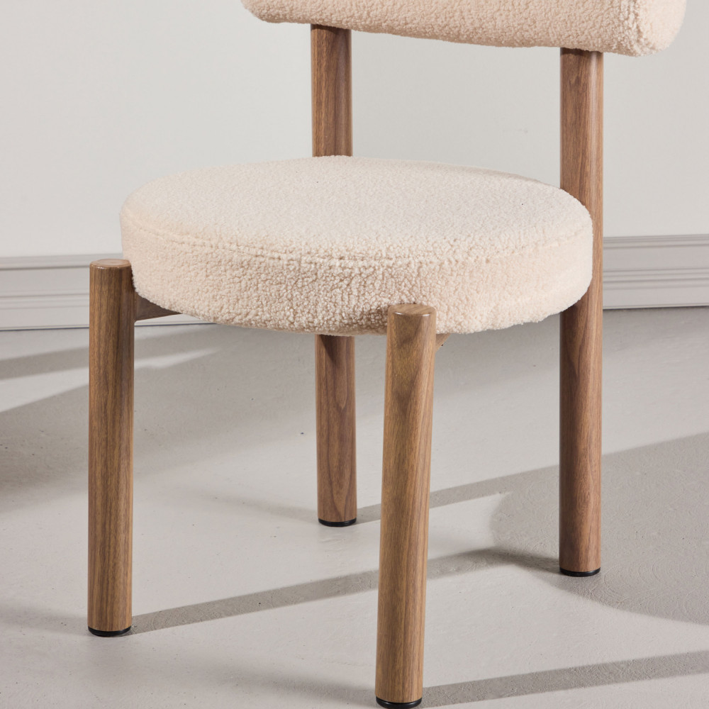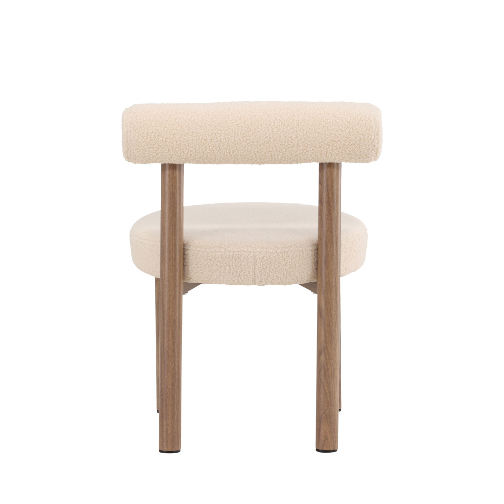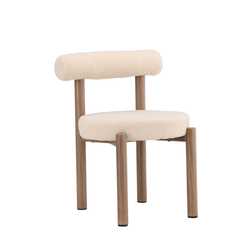 Ces chaises affichent un design plutôt sobre. Elles se dotent d'une assise ronde épaisse à souhait, pour un confort optimal, puis d'un dossier assez original sans être excentrique, constitué non pas d'un panneau droit ou incurvé mais d'un rondin doudou : très cosy, n'est-ce pas ? Elles sont également pourvues de pieds cylindriques qui forment un contraste avec la bouclette, pour un look affirmé. Ce piètement a été conçu en métal effet bois : on s'y tromperait !