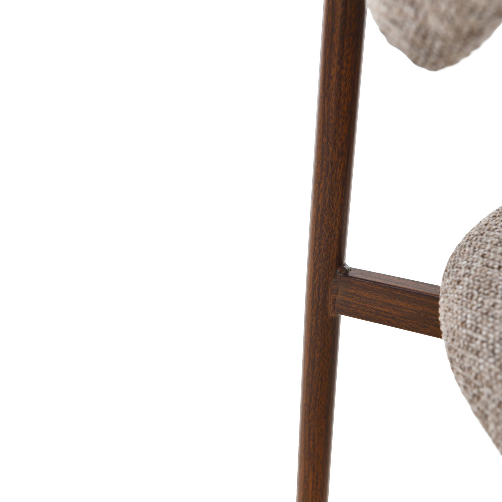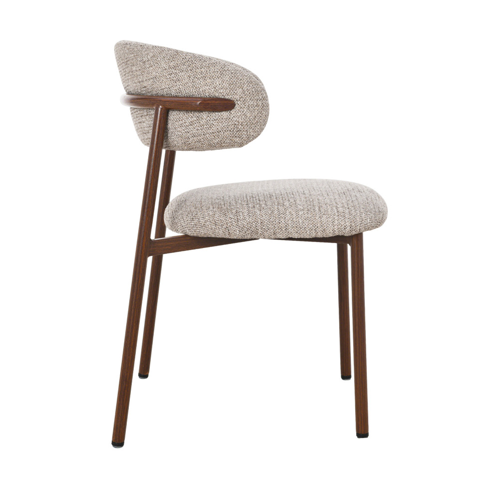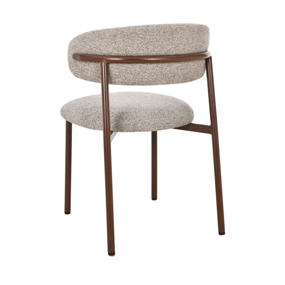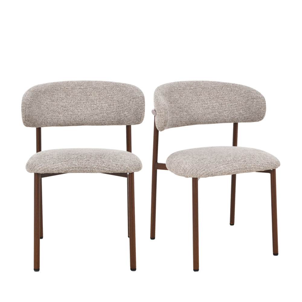 Ces chaises se dotent d'un petit dossier courbé enveloppant et d'une assise arrondie, tous deux revêtus de tissu (100% polyester). Pour votre confort : l'assise et le dossier sont garnis de mousse, avec une densité de 24kg/m3 pour l'assise. Un piètement tout en finesse en métal effet bois foncé complète le tout. Bluffante cette finition plus vraie que nature, non ? Cela apporte un style vintage au modèle, tout en restant intemporel.