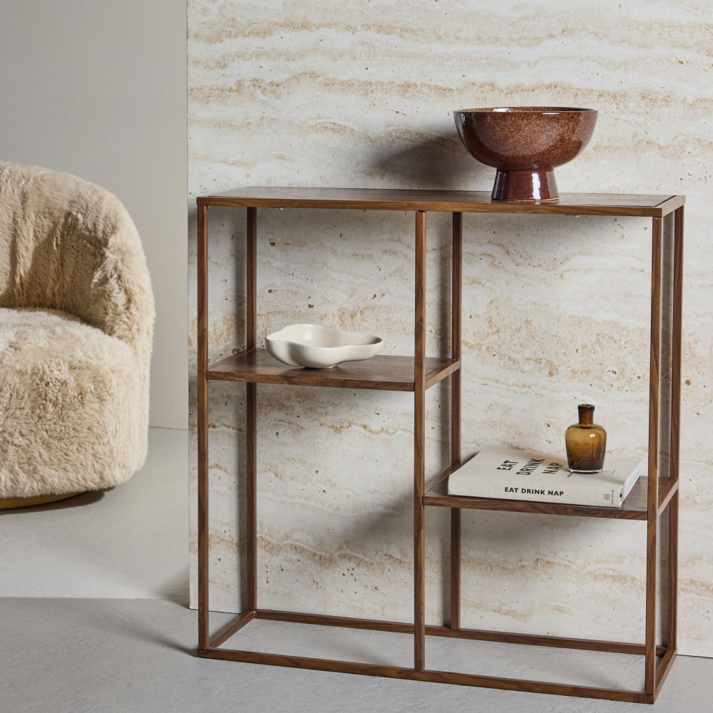 Vous aimez le mobilier au look épuré ? Alors vous allez adorer l'étagère en bois effet noyer et métal Staal proposée par la marque Venture Home ! Discret et peu encombrant, ce modèle tout en finesse se pare de lignes droites et nettes, dans un esprit minimaliste.