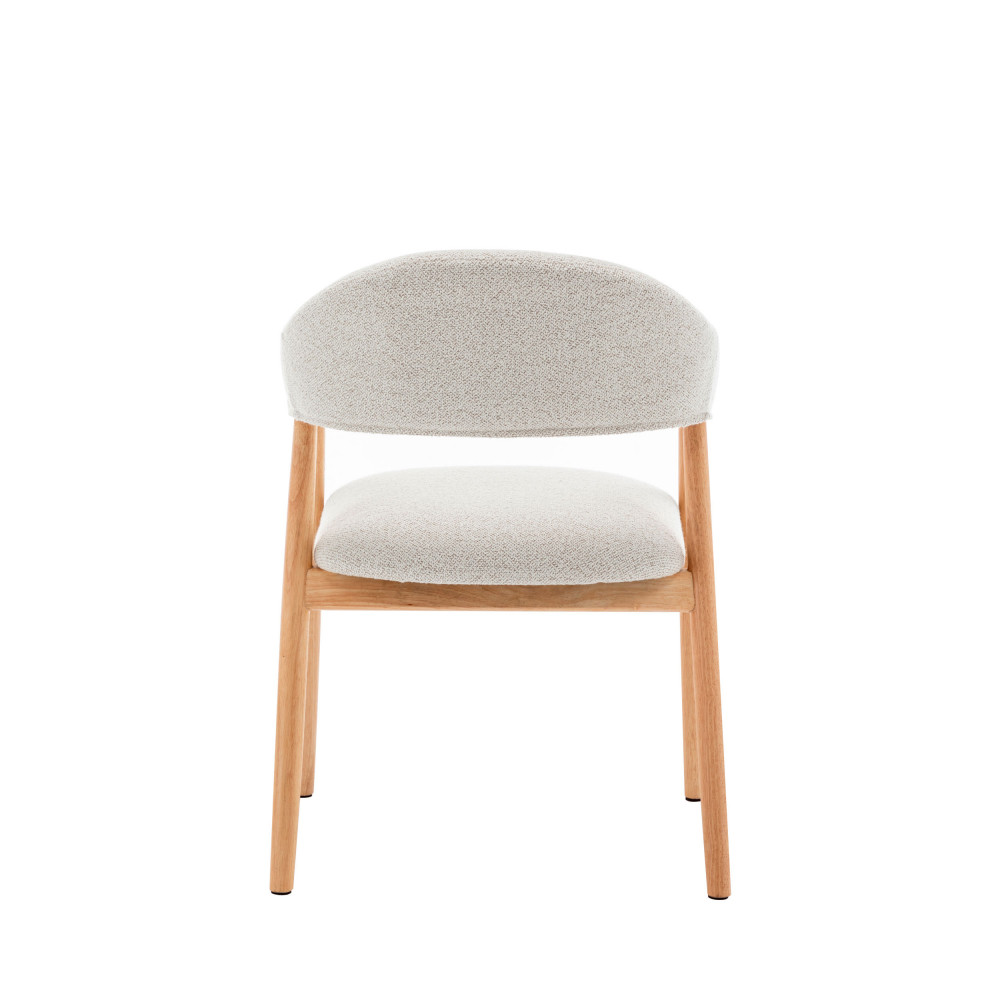 Ce duo de fauteuils est l’alliance parfaite entre confort et style bohème. Rien qu’à les voir, on s’imagine bien en train de discuter autour d’un bon repas, confortablement installé sur l’assise rembourrée en tissu bouclette 100% polyester. Les accoudoirs, recouverts de cette même matière agréable et cosy, vous donneront l’impression d’être dans un cocon de douceur. La structure en contreplaqué et les pieds évasés en bois massif d’hévéa sont l’assurance d’une stabilité parfaite et d’une touche naturelle et élégante.