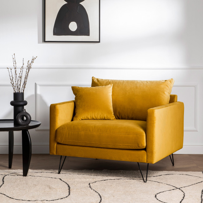 Avec un canapé, votre salon est déjà bien équipé, mais pourquoi ne pas compléter cet espace détente avec un fauteuil ? Cela vous fera une assise supplémentaire et renforcera le côté cocooning de la pièce. On vous propose par exemple le fauteuil made in France en velours 100% polyester Villabon. On aime son look vintage, contrebalancé par des pieds métalliques en épingles de 18 cm de hauteur.