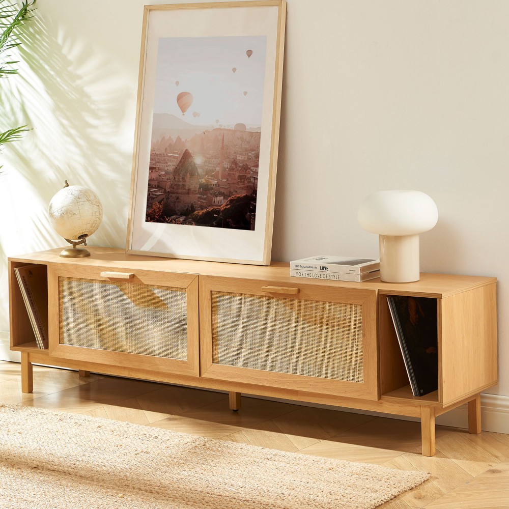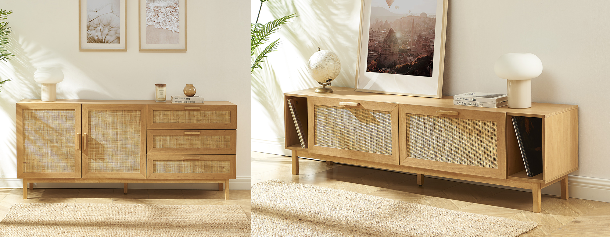 Comme l'ensemble de la collection, elle est fabriquée en MDF et mélaminé, présente des lignes sobres et un style bohème tout en douceur. Des pièces en rotin magnifient ses façades, tandis que du bois massif d'hévéa a été utilisé pour confectionner ses pieds et ses poignées, renforçant ainsi sa durabilité.