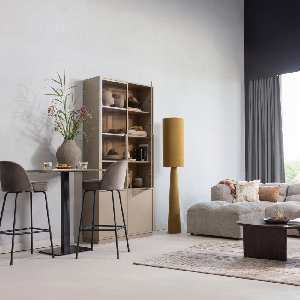 Ce luminaire affiche un style affirmé et tendance. Il peut se combiner avec des meubles en bois clair ou foncé, ou encore avec des assises en tissu bouclette pour rappeler la texture de son abat-jour. Un choix idéal pour créer une atmosphère conviviale et raffinée.