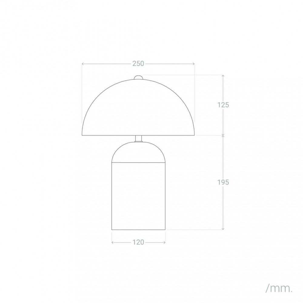Avec ses 34 cm en hauteur et ses 25 cm en largeur comme en profondeur, cette lampe à poser est assez grande sans être massive. Elle présente une forme champignon classique, avec une base cylindrique robuste et un abat-jour en cloche.