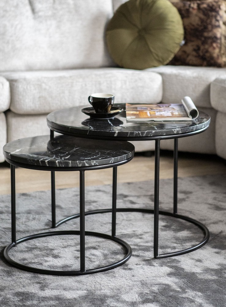 Si vous avez un intérieur contemporain, et que vous recherchez autre chose que du bois, alors pourquoi ne pas opter pour des tables basses gigognes en marbre et métal ? Ces deux matières vont vraiment bien ensemble, et pour agrémenter le tout, vous pourriez même placer un beau tapis de salon blanc et tout doux juste en-dessous (un petit conseil de la team, après c’est vous qui voyez…).