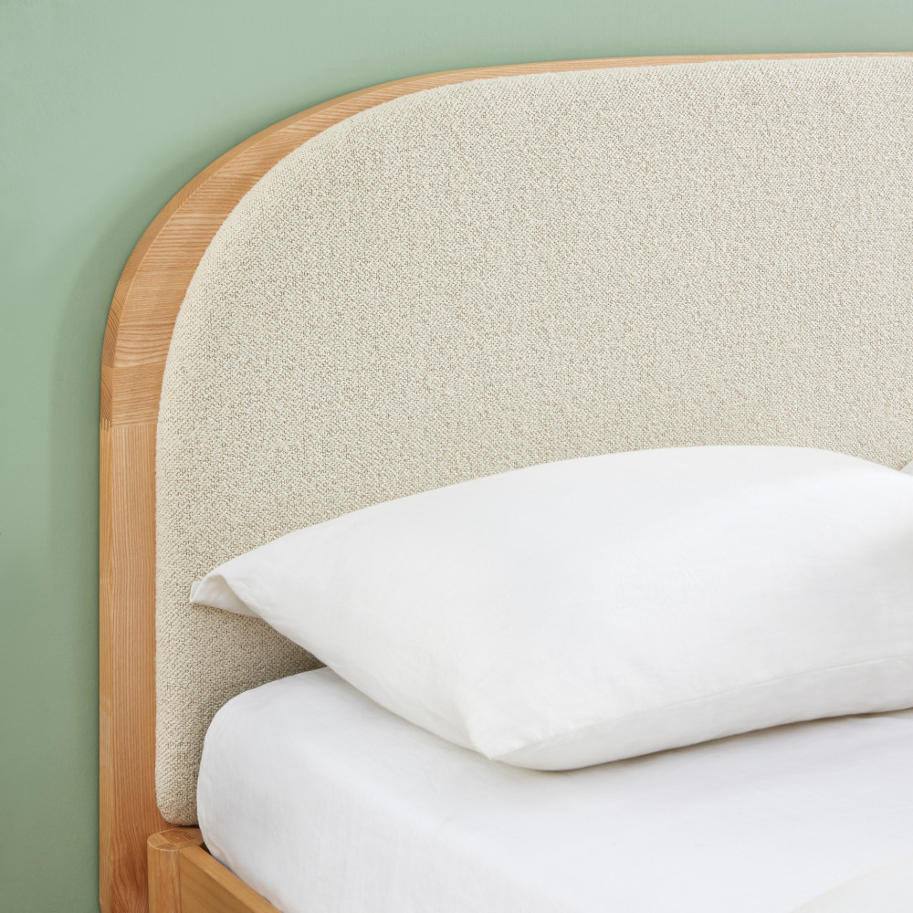 Drawer vous propose ici un lit double très accueillant, composé d'une tête de lit en bois (placage frêne) à bords arrondis doublée de tissu bouclette (polyester) pour la douceur et le confort. Il est également doté d'un cadre de lit classique en bois avec des pieds cylindriques (piètement en bois massif de frêne). On a l'habitude de voir des lits en bois ou en acier et des têtes de lit en tissu, en rotin ou en velours, mais le mix bois et tissu bouclette est plus rare. Très sympa ce rendu, n'est-ce pas ?