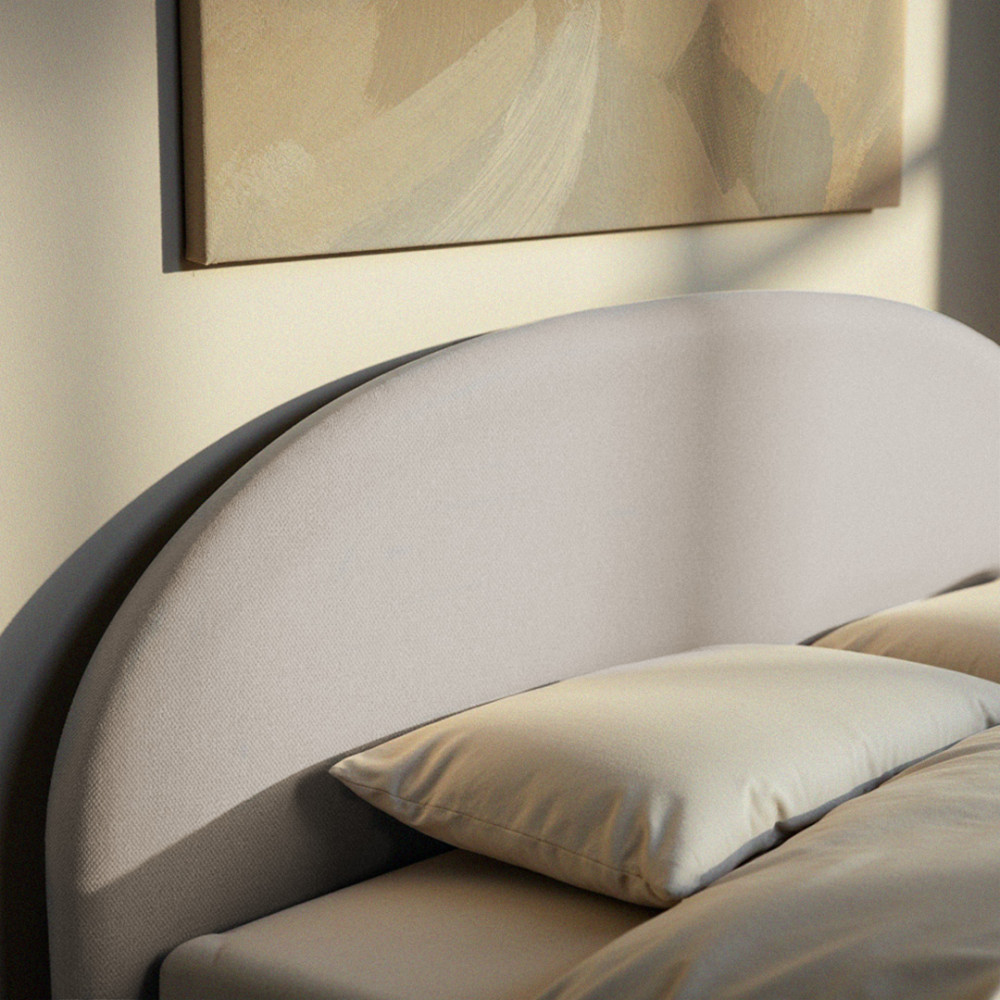 - Il est doté d'une tête de lit arrondie recouverte de tissu (100% polyester), puis d'un cadre de lit au look standard également revêtu de tissu