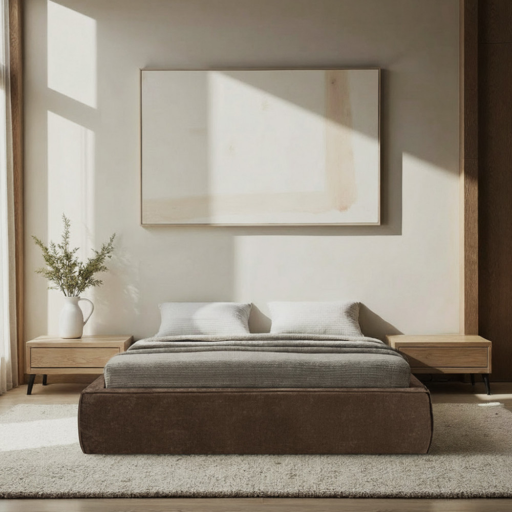 En un geste, la pièce paraît plus nette, plus organisée, presque transformée. Son sommier à 32 lattes assure un maintien fiable et homogène, idéal pour profiter pleinement de vos nuits. Les dimensions généreuses, 230 cm de largeur, 206,5 cm de profondeur et 91,5 cm de hauteur, lui donnent une vraie présence sans pour autant déséquilibrer l’espace. Il a cette faculté très précieuse de structurer la chambre tout en laissant respirer votre décoration. Pour son plus grand plaisir, agrémentez-le de quelques coussins bien choisis, d’un tapis texturé et d’une lumière douce et Liberia deviendra aussitôt le centre de la pièce.