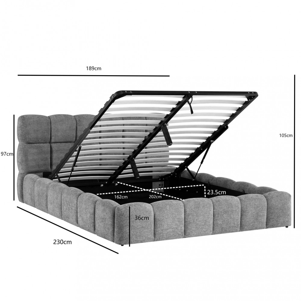En plus d'être élégant, ce lit entièrement recouvert de tissu (polyester) d'une taille totale de 97 x 189 x 230 cm est bien pratique grâce à son coffre de rangement de 0,86m3 de volume. Ce dernier est très facilement accessible en relevant le sommier. Vous pourrez y ranger du linge de lit, des vêtements hors saison ou tout qui traîne dans votre chambre.