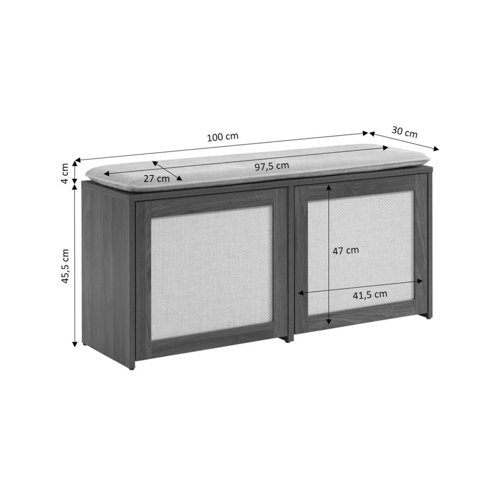 Avec ses dimensions compactes – 100 cm de largeur, 35 cm de profondeur et 45 cm de hauteur – il offre une assise confortable et un espace de rangement intégré pour vos chaussures (jusqu'à 8 paires).