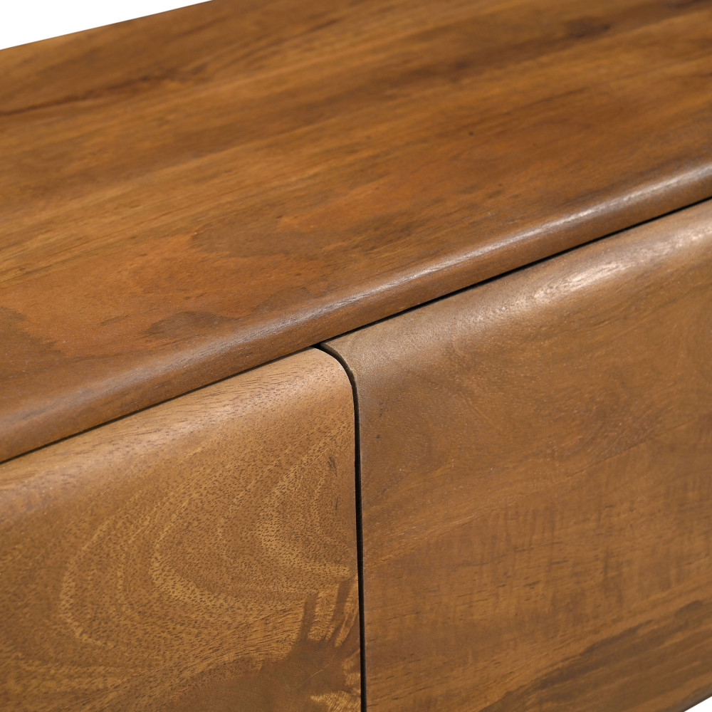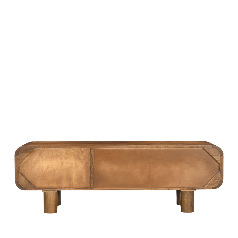 Coup de coeur pour ce meublé télé de qualité confectionné en bois de manguier, un beau bois exotique. De forme rectangulaire avec des bords arrondis pour plus de douceur, ce modèle de style vintage affiche des lignes simples et se pare de finitions soignées. Bien stable, il se tient sur 4 maxi pieds cylindriques de 20 cm de haut qui apportent du caractère à l'ensemble.