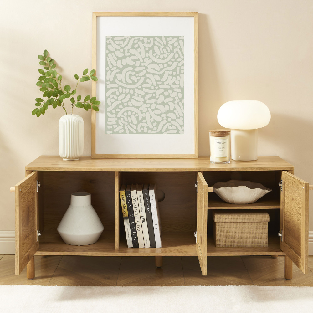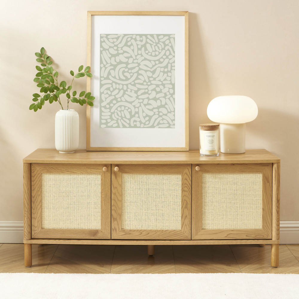 Le meuble TV Iris mêle subtilement charme naturel et fonctionnalité. Grâce à son design épuré et ses 3 portes en bois et cannage, il apporte une touche légère et texturée à votre salon tout en dissimulant vos équipements.