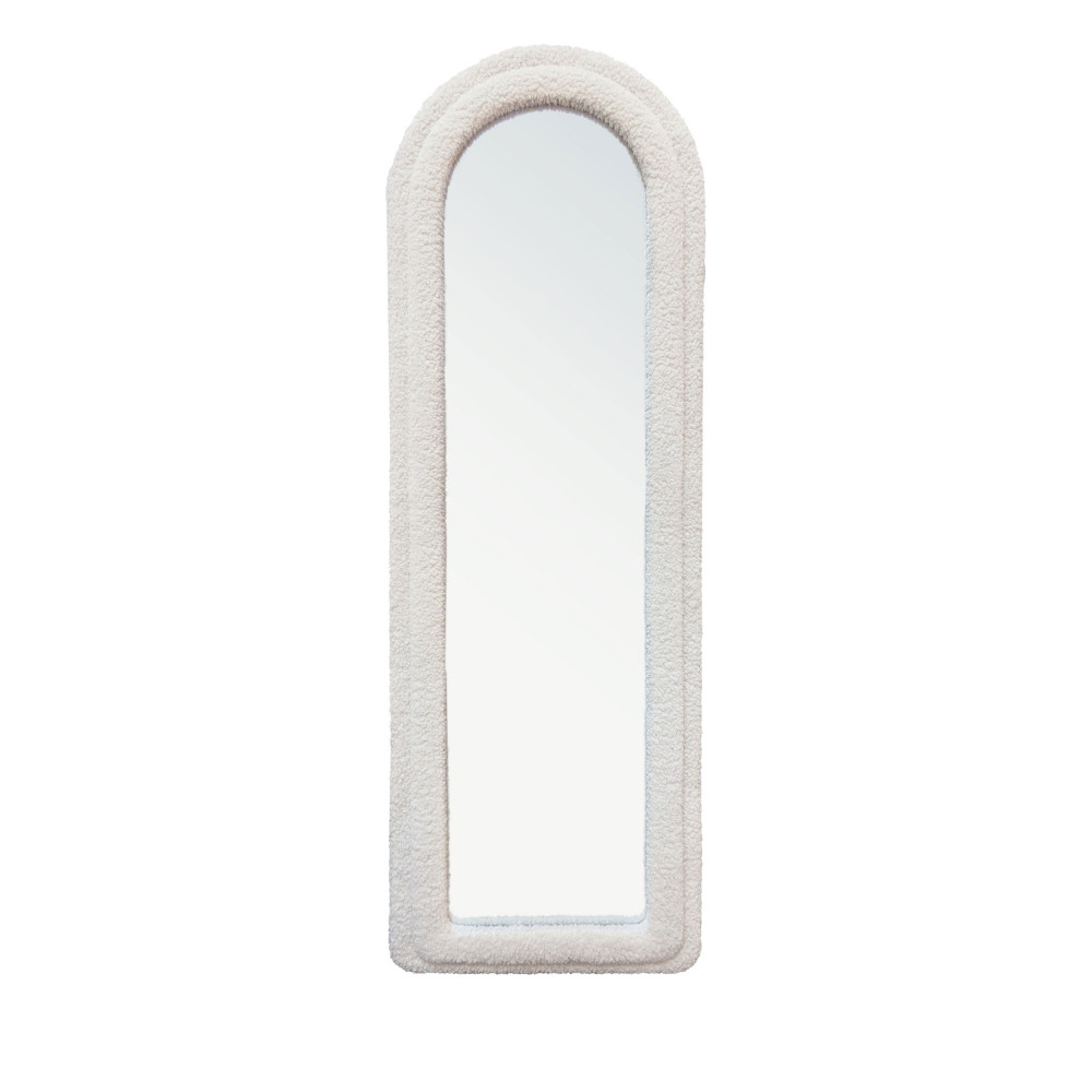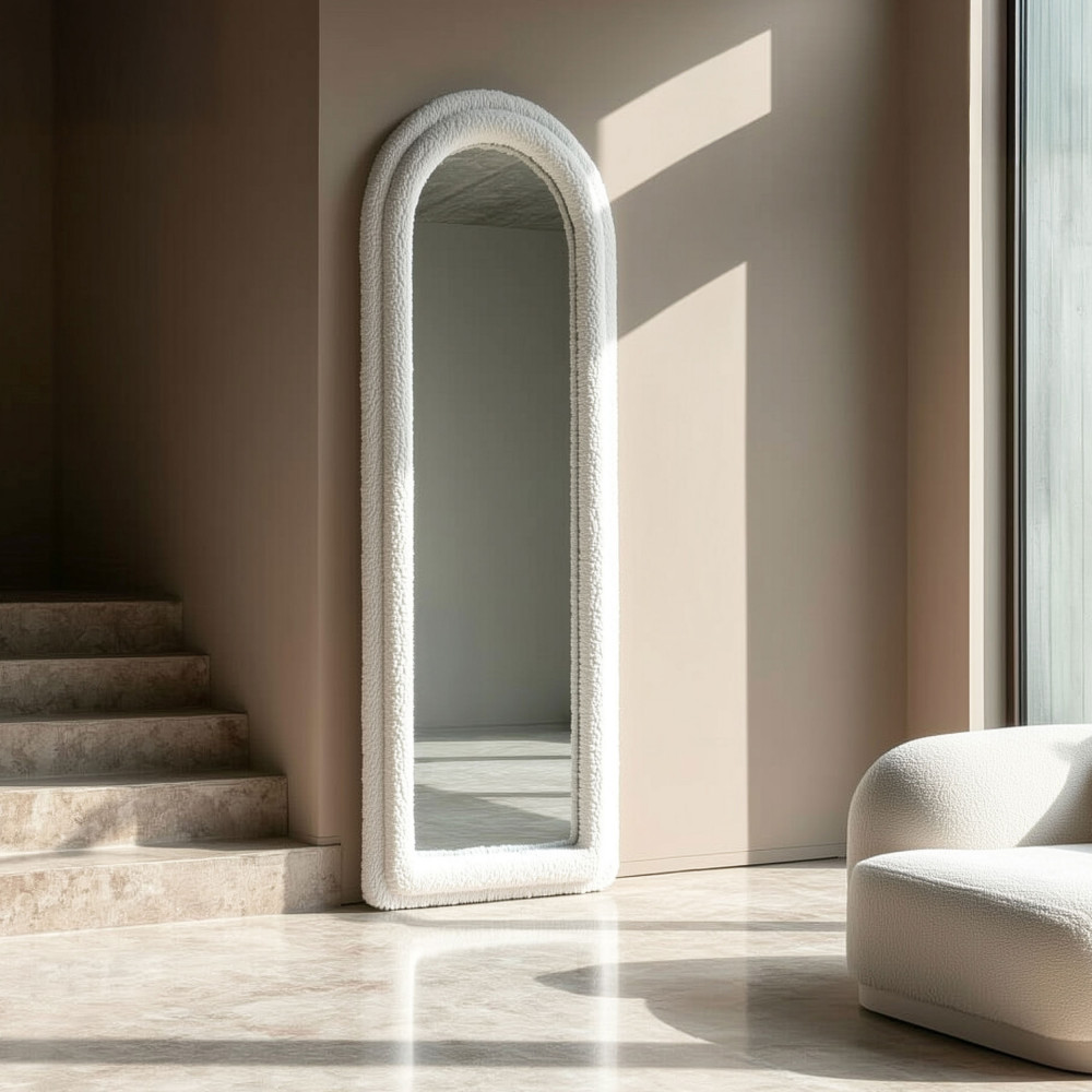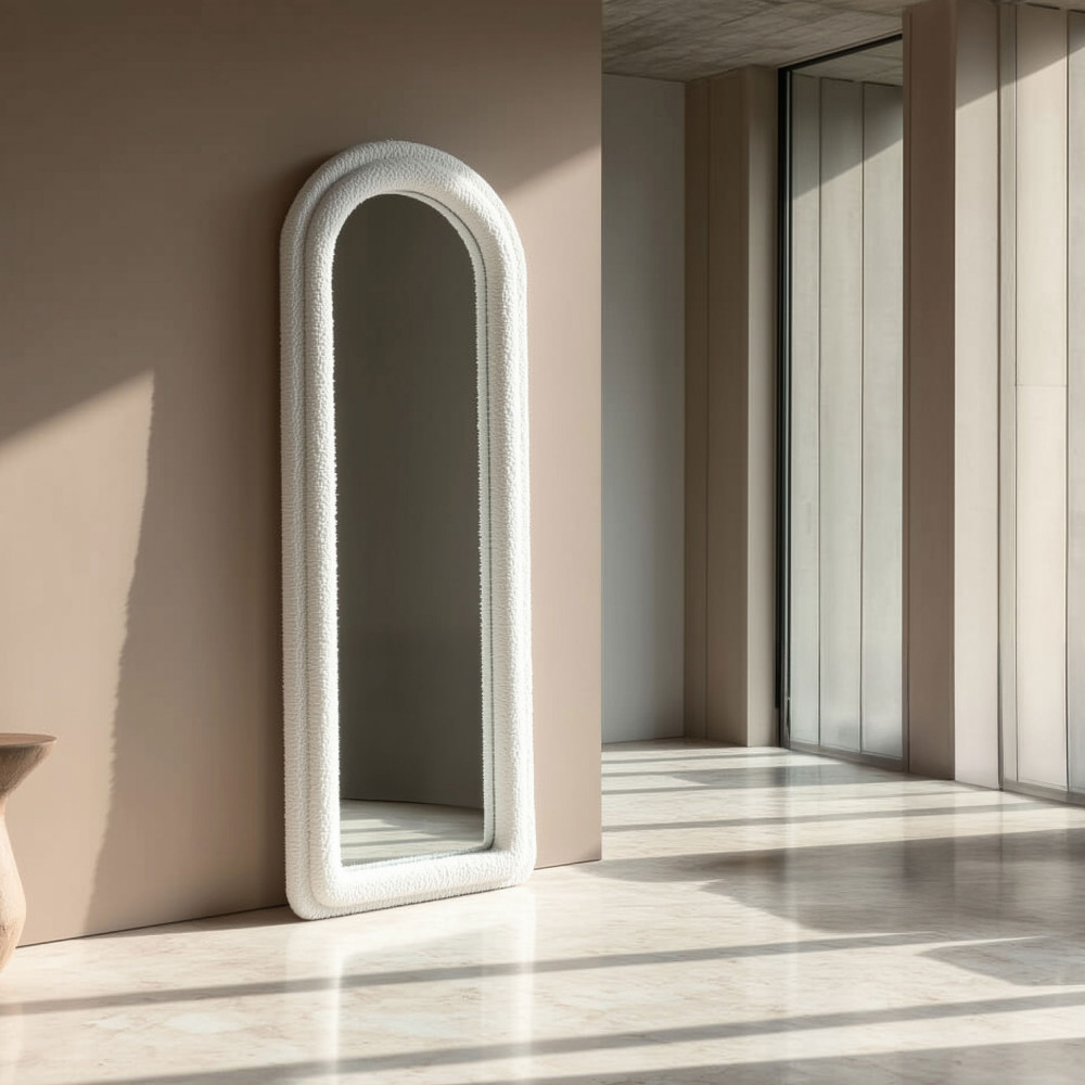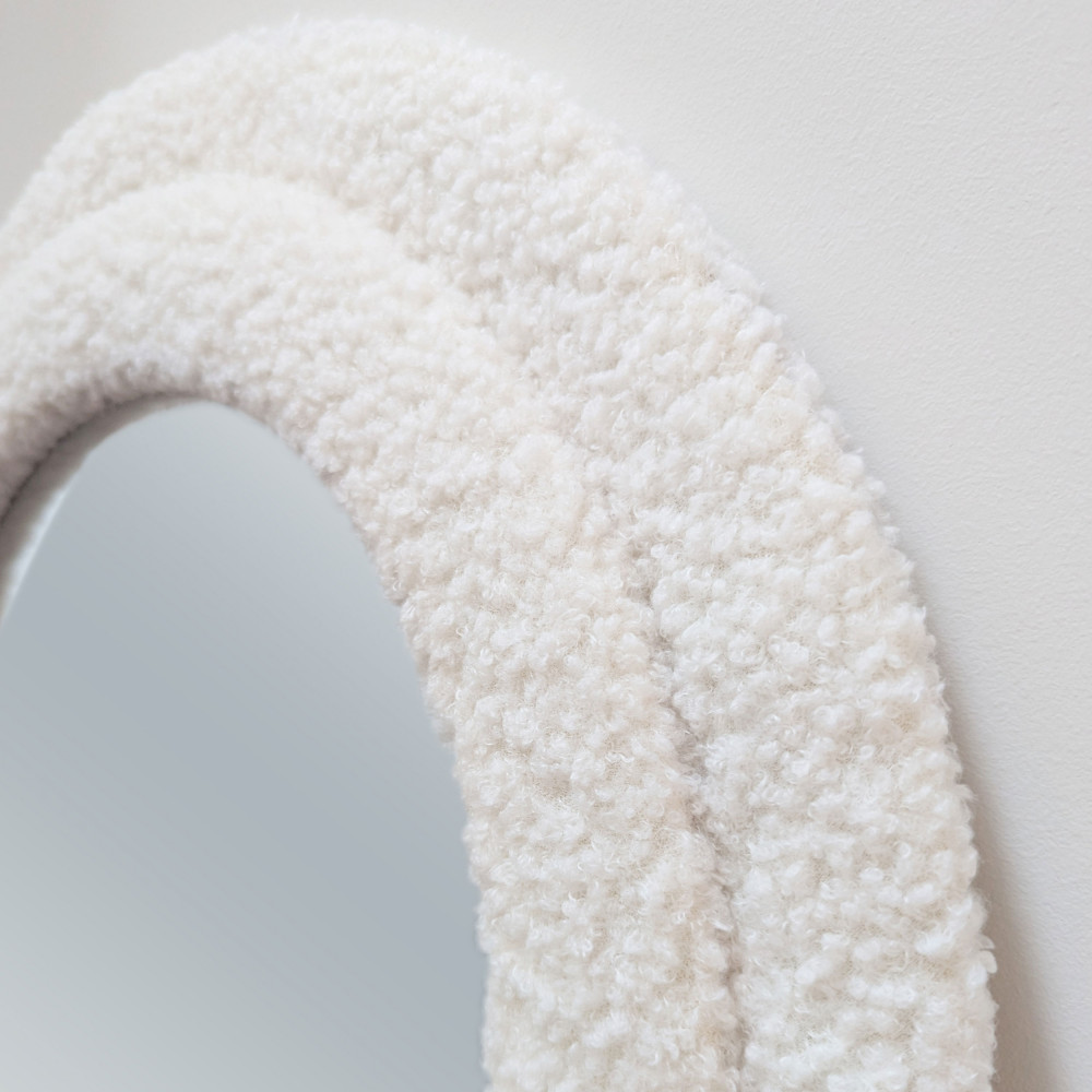 Le miroir Orikum de Drawer revisite la forme arche dans une version ultra douillette. Son cadre en bouclette au toucher doux contraste joliment avec la sobriété du miroir, créant un bel équilibre entre minimalisme et chaleur.