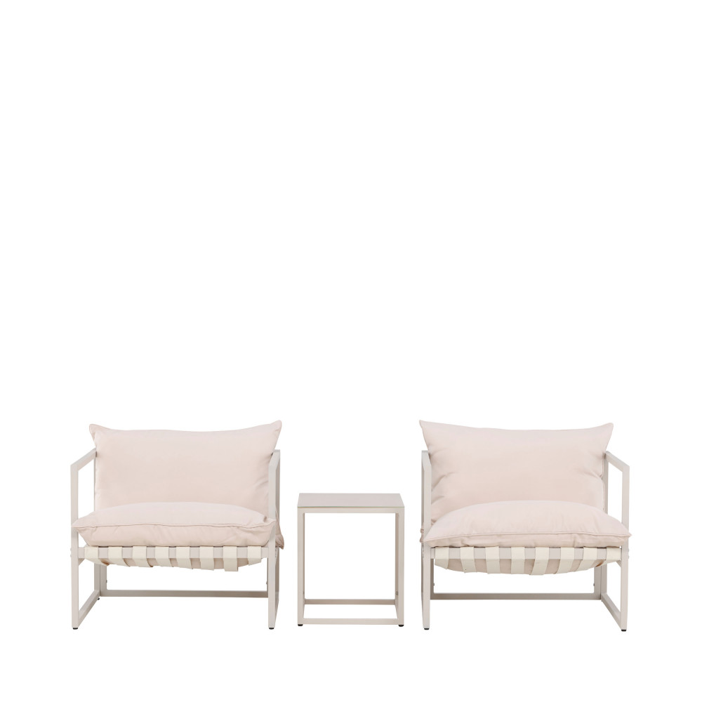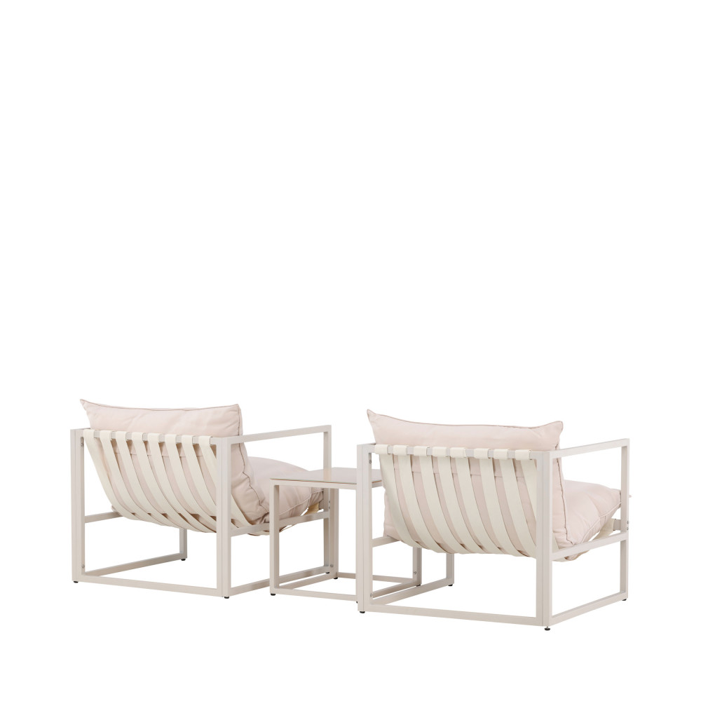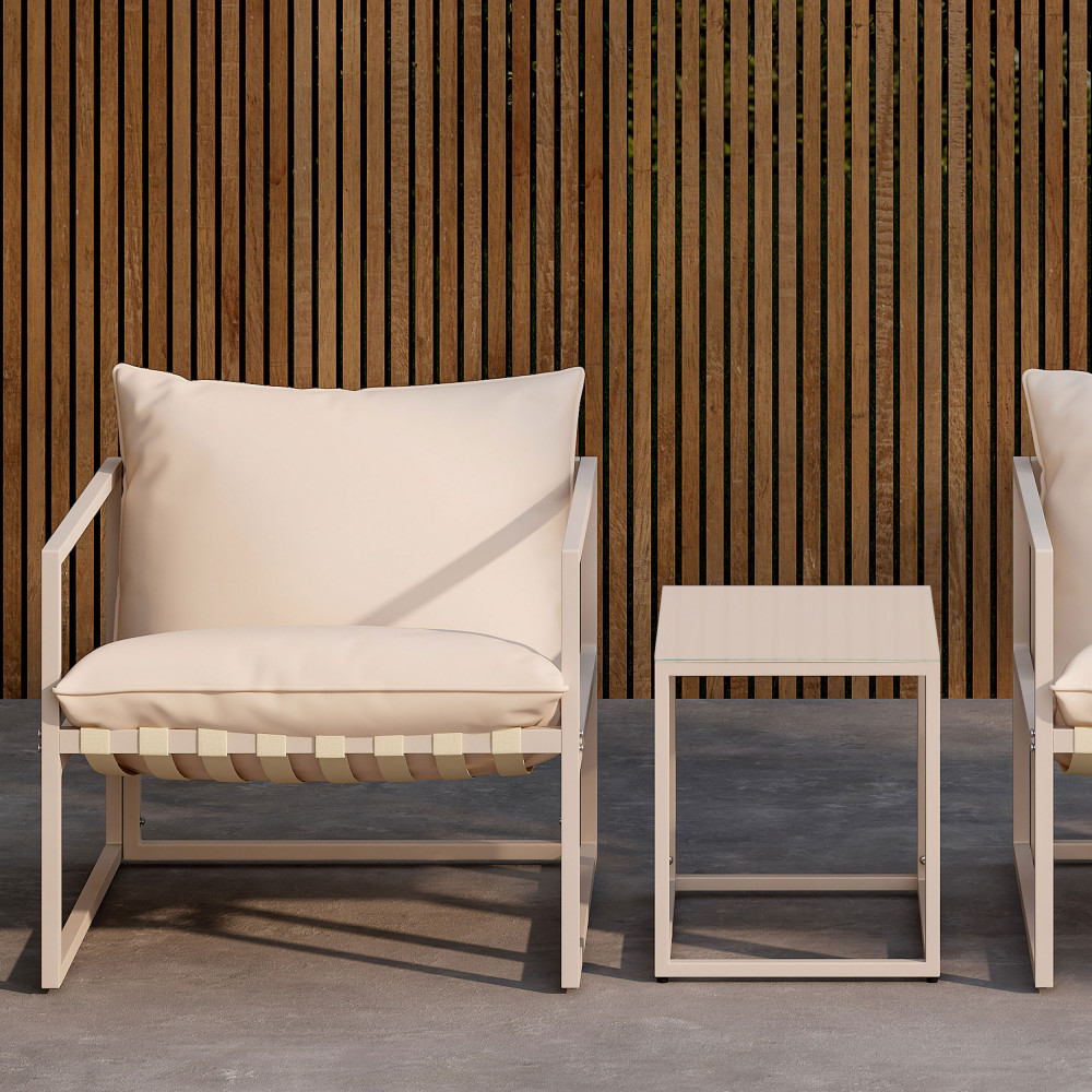 Avec ses deux fauteuils cosy et sa table dotée d’un plateau en verre, cet ensemble allie élégance et simplicité. Le piètement en acier de ces 3 éléments garantit une solidité à toute épreuve, même face aux aléas de la météo. Les coussins en polyester, quant à eux, sont non seulement ultra-confortables, mais aussi faciles à laver. Une goutte de café, une tache de confiture, un accident est si vite arrivé… La hauteur d’assise de 30 cm vous permettra de profiter de vos moments de détente, seul ou accompagné, dans une position idéale, tandis que les dimensions généreuses de 75 cm de largeur, 75 cm de profondeur et 61 cm de hauteur assurent un confort optimal sans trop encombrer votre petit coin de paradis extérieur.