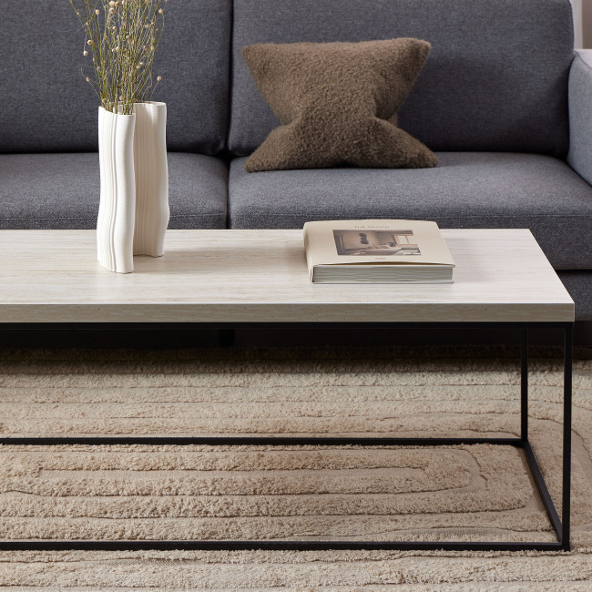 Ce modèle se dote d'un plateau à la forme rectangulaire conçu en médium et mélaminé façon travertin, une matière tendance, qui se tient sur une fine structure en métal.