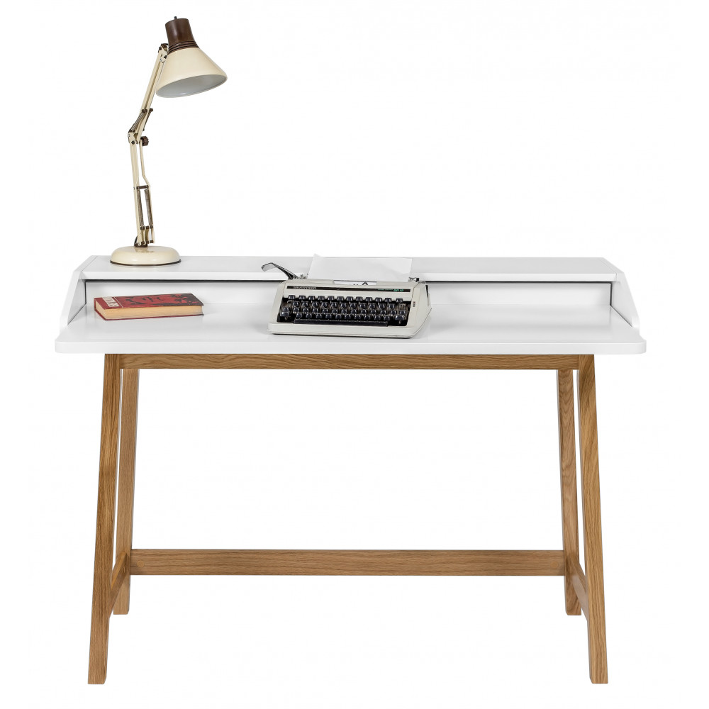 La table de bureau en bois de chêne Saint James se différencie des autres grâce à sa tablette extensible permettant d’obtenir un espace de travail confortable et assez large pour déposer documents et/ou ordinateur. La partie haute du meuble peut servir de support pour poser une lampe de bureau, un pot à crayons ou des objets décoratifs.