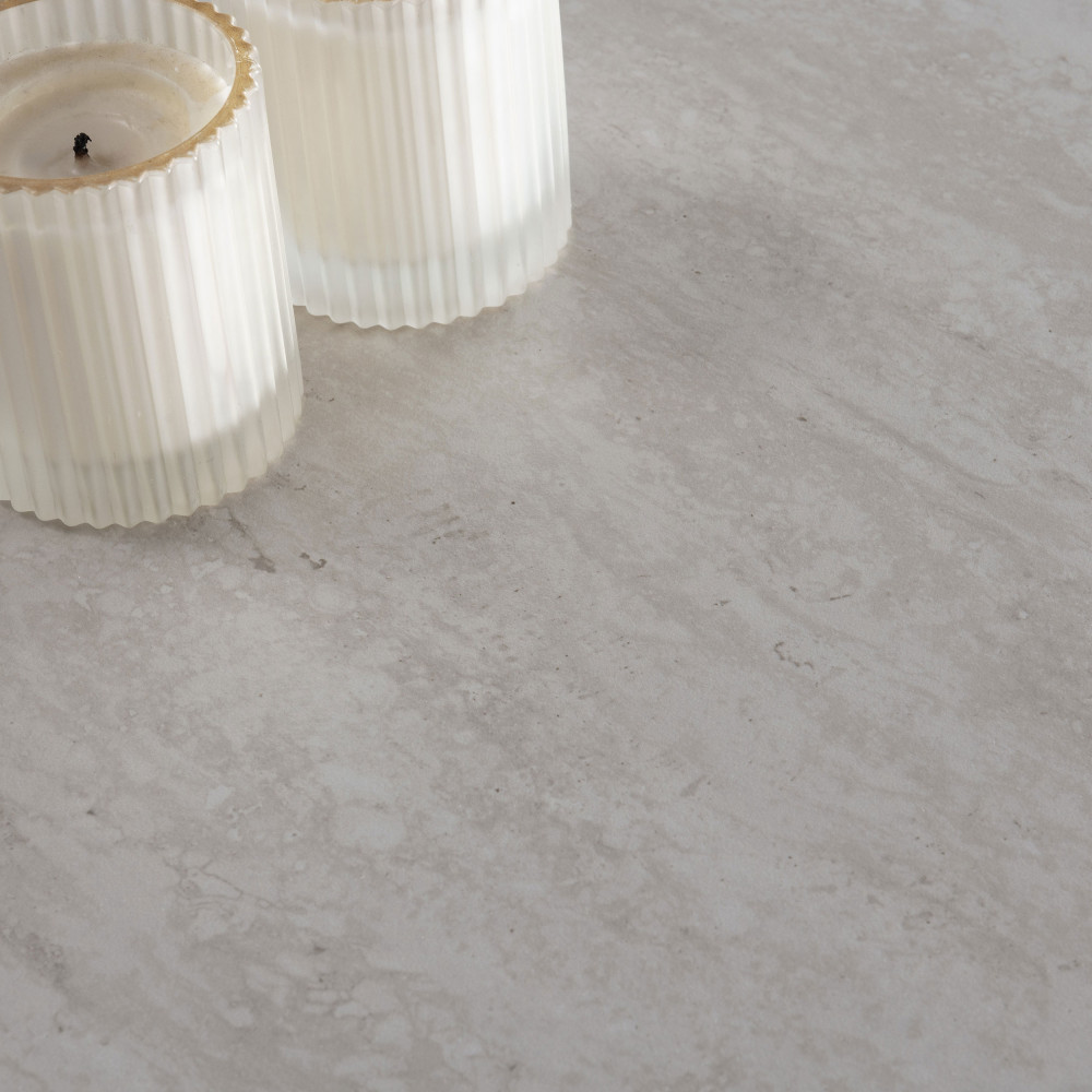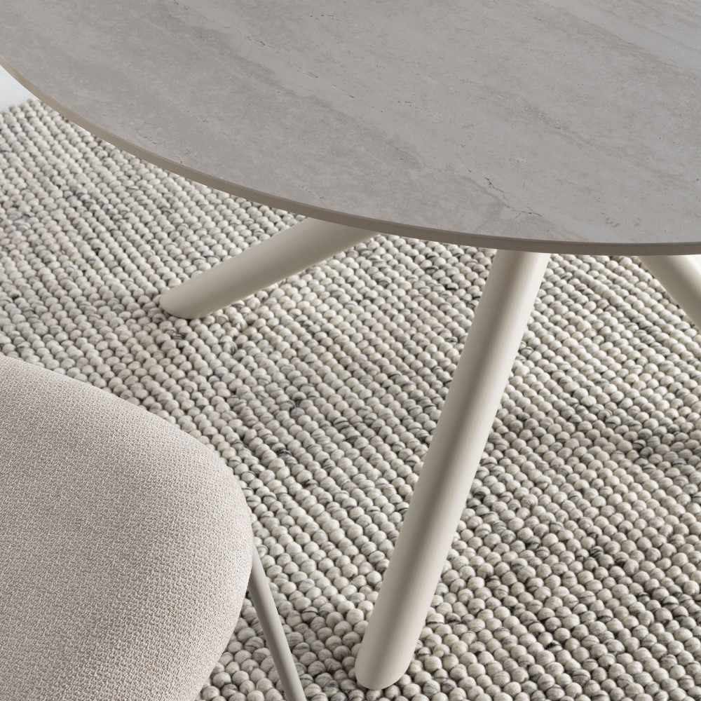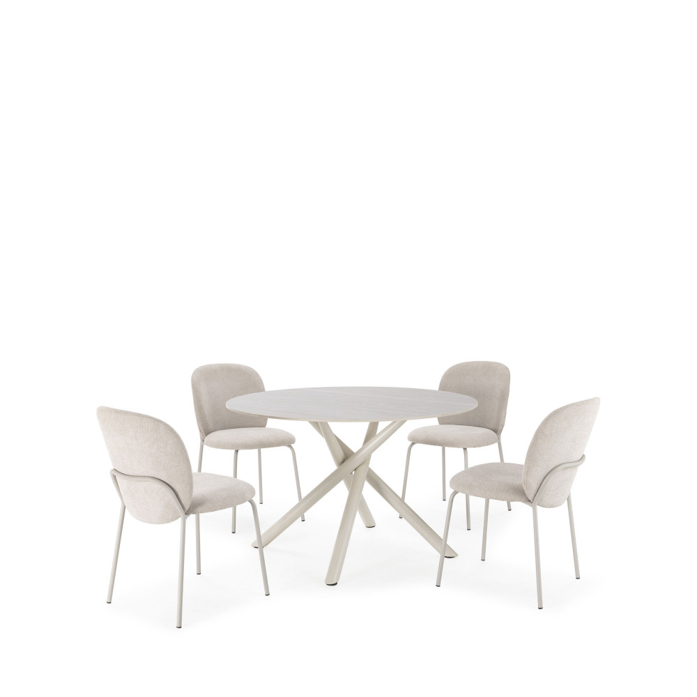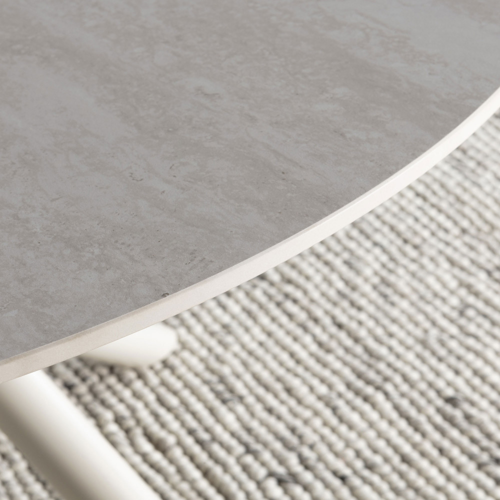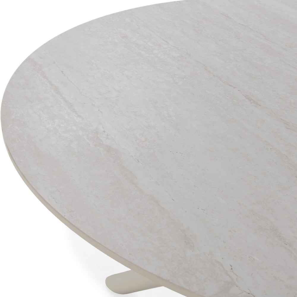 Ce modèle se pare en effet de lignes simples mais bien pensées et de finitions soignées. Il se compose d'un plateau fin rond en céramique effet travertin, soutenu par 4 pieds cylindriques en métal beige. Placés en biais et croisés au centre, ils forment une jolie base pleine de caractère.