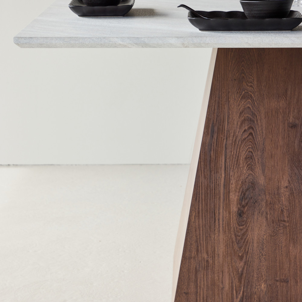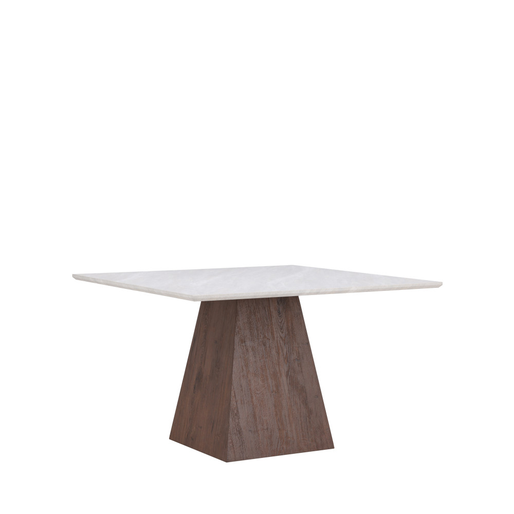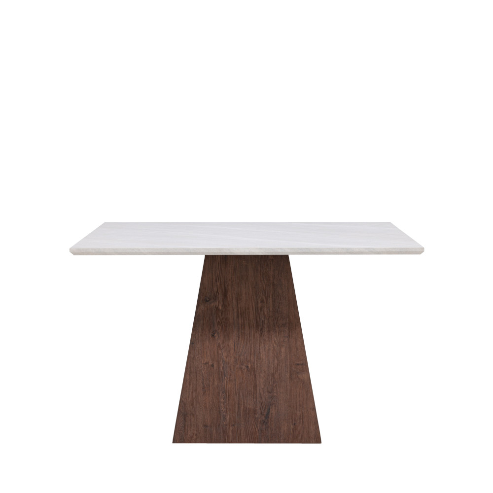 Cette table repas est pourvue d'un plateau carré, une forme classique mais néanmoins moins courante que le rond ou le rectangle au rayon table à manger. Elle se dote également d'un maxi pied central de forme pyramidale. On aime ce modèle tout en contrastes, tant côté formes et volumes que côté finitions, entre le piètement en bois et le plateau effet marbre. C'est donc un beau mariage entre robustesse et délicatesse, authenticité et élégance. Et vous, qu'en dites-vous ?