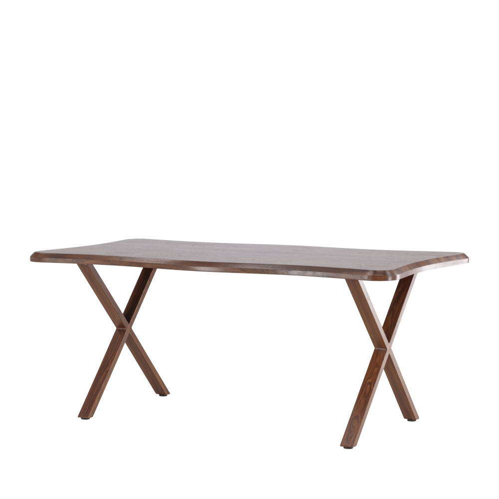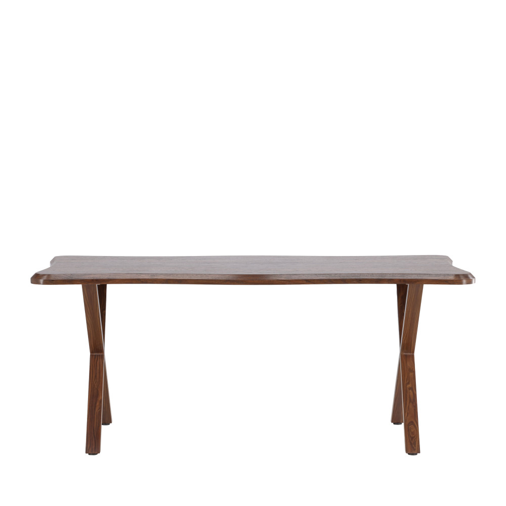 Ici, tout est dans les détails : le plateau en bois foncé (MDF et papier) effet noyer affiche une forme rectangulaire, avec des angles arrondis pour plus de douceur et des bordures courbées et biseautées pour apporter une note d'originalité. Ce plateau est soutenu par des pieds en croix dotés de patins pour protéger vos sols. Ce piètement est confectionné en métal coloris bois, pour un ensemble monochrome.