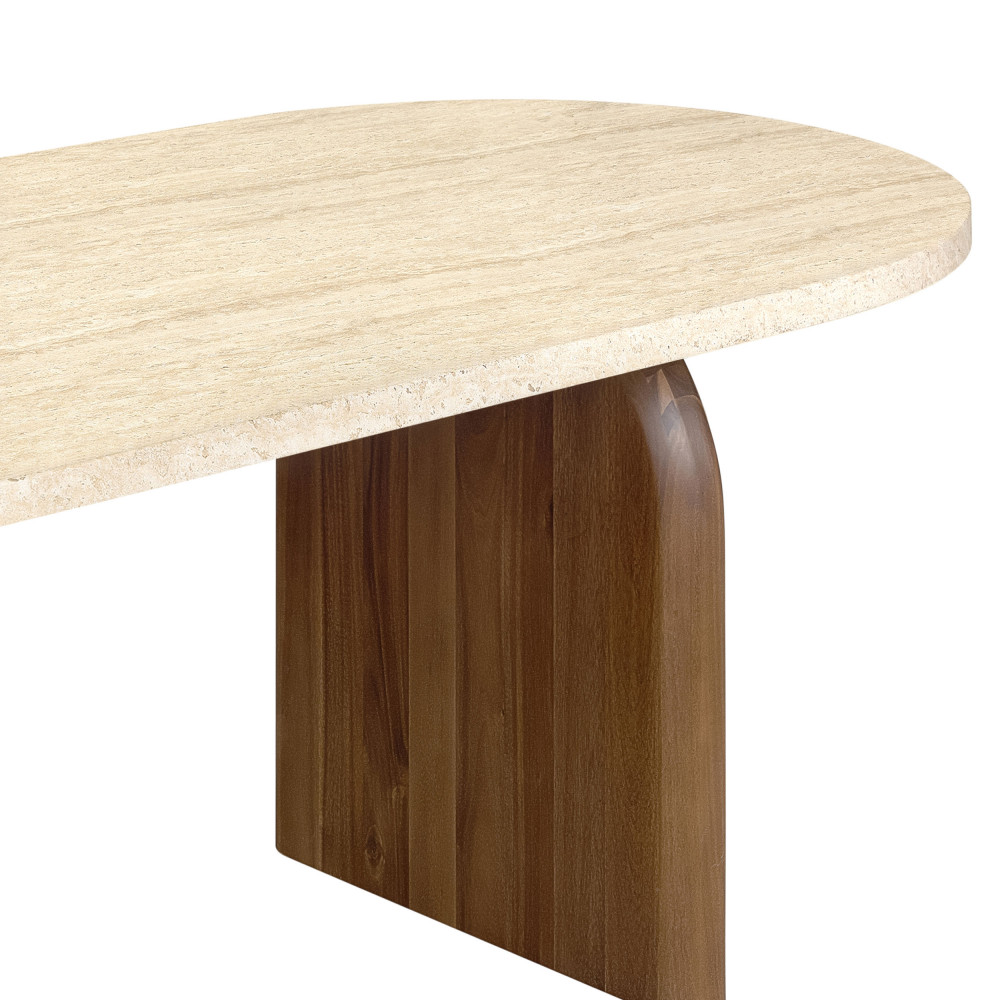 Cette table repas de qualité se dote d'un plateau à la forme ovale plutôt épais effet travertin (fait de polyciment), au look plus vrai que nature. Il reprend parfaitement les nuances de cette matière très prisée. Ce dernier se tient sur 2 maxi pieds en bois foncé (bois massif d'acacia) en forme d'arches pleines et bien épaisses, qui apportent un joli contraste.