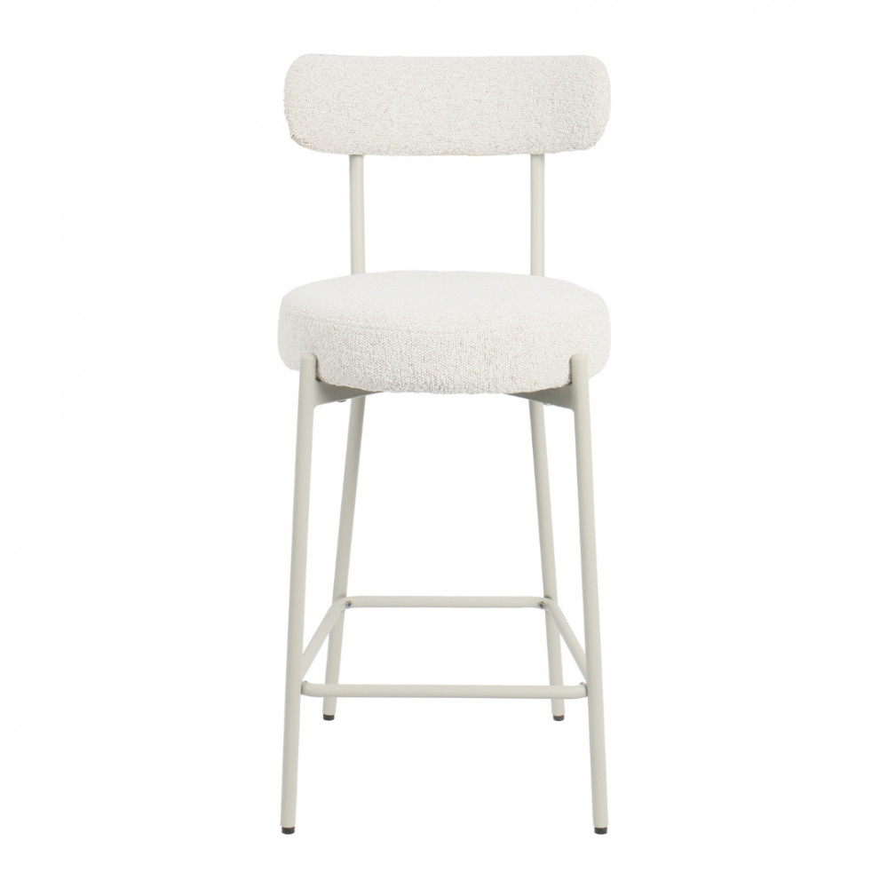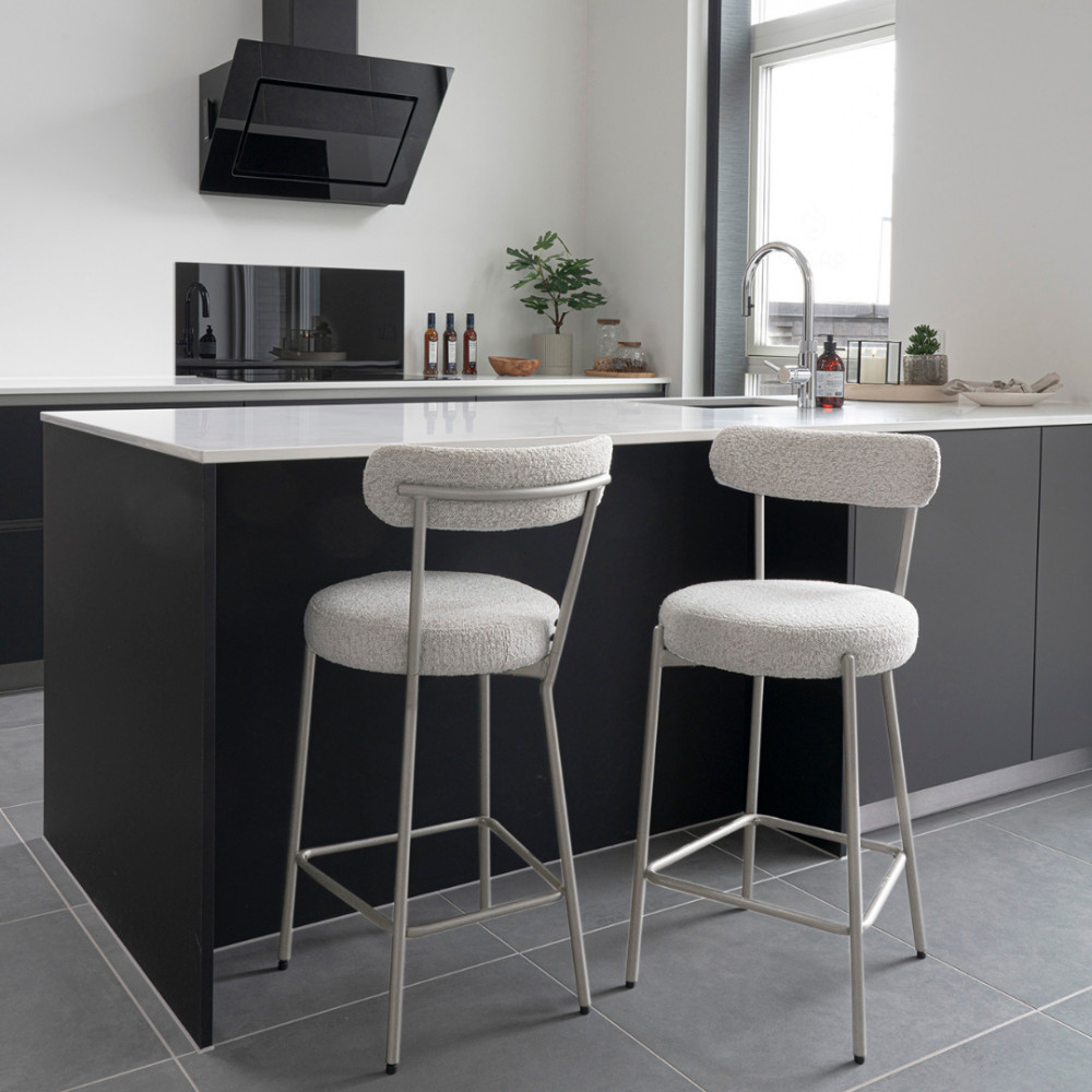 Si, en déco, vous aimez la sobriété, vous apprécierez sûrement ce modèle aux lignes simples, modernes et indémodables à la fois. Très confortable, cette chaise de bar se dote d'une assise ronde épaisse et d'un petit dossier incurvé, le tout paré de tissu bouclette (100% polyester), cette matière tendance qu'on adore.