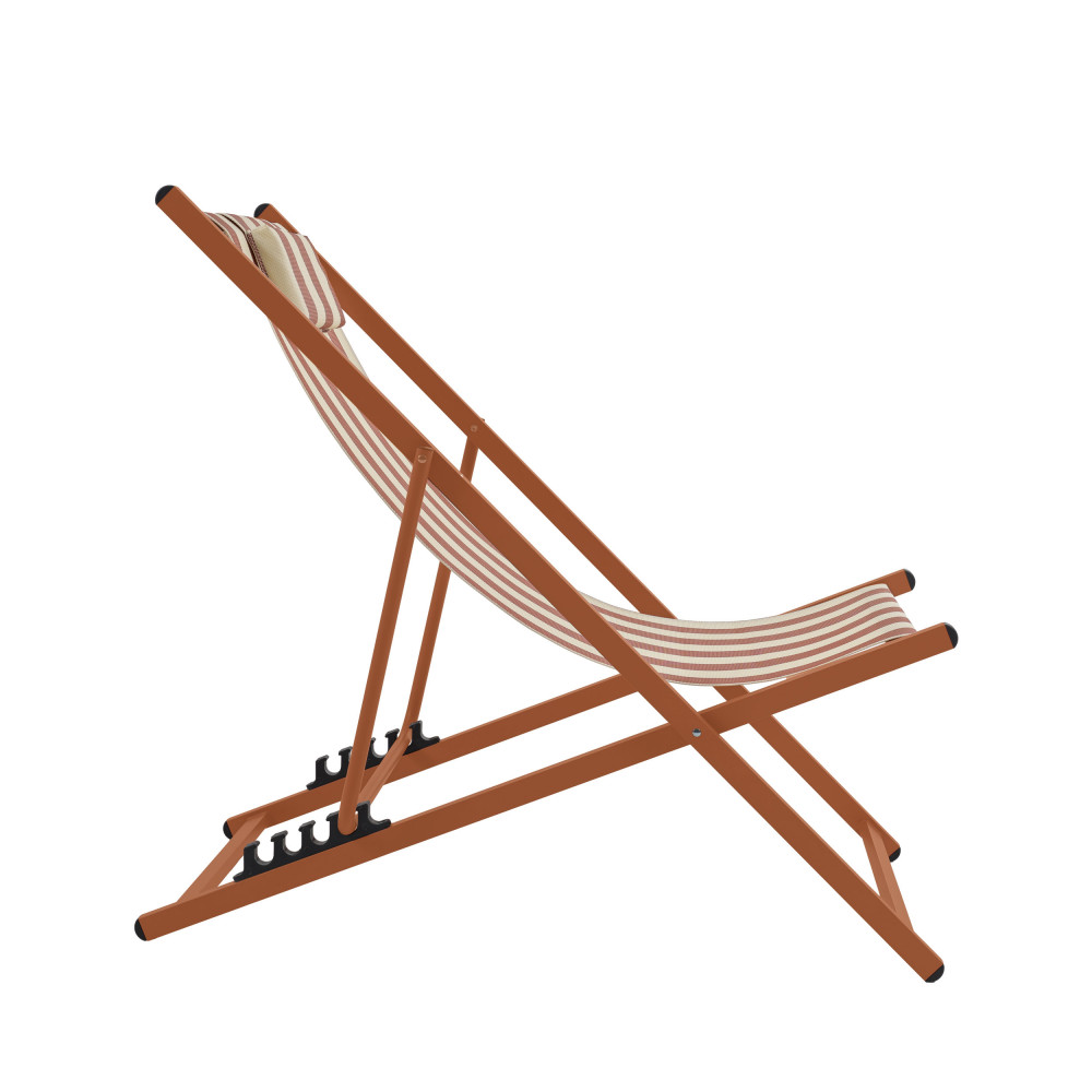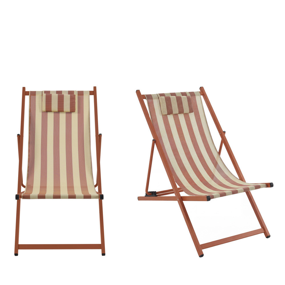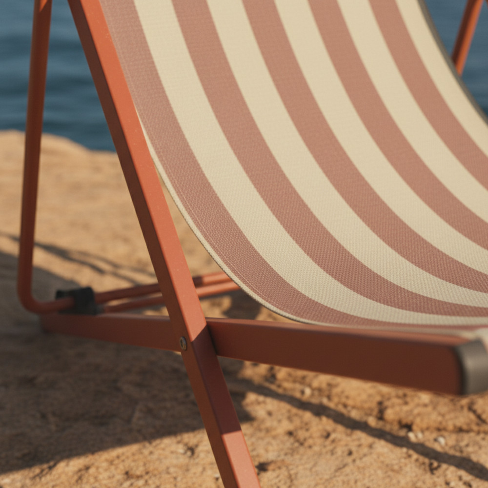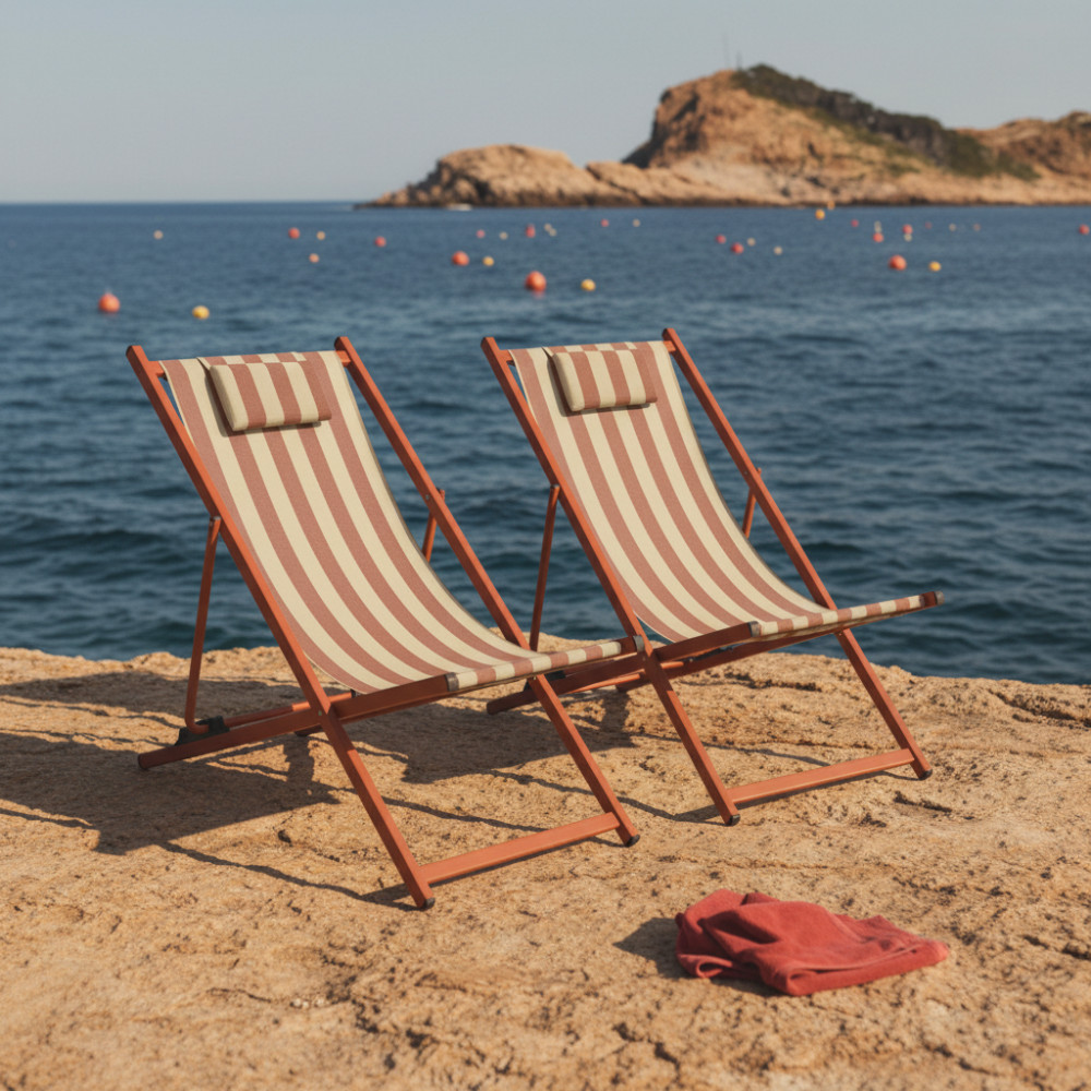 Leur silhouette légère associe une structure en aluminium avec revêtement poudre à une toile en textilène rayé (70 % PVC, 30 % polyester), résistante et facile à vivre. Le tissu épouse naturellement le corps tandis que le coussin de tête intégré, rembourré en mousse, invite à poser la nuque et à décrocher pour de bon. Grâce aux 4 positions réglables, vous passez d’une lecture bien droite à une sieste presque allongée en un geste. Et quand la journée se termine, elles se plient en un clin d’œil pour se ranger sans encombrer.