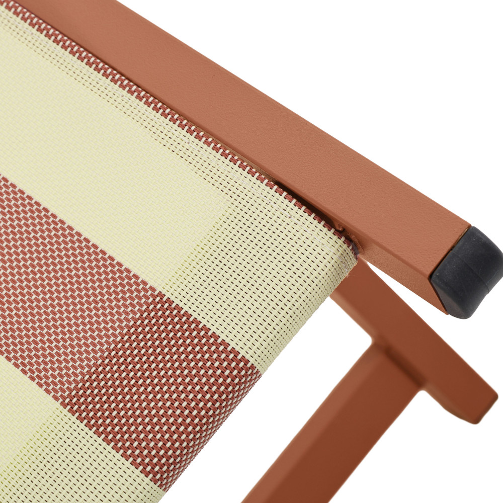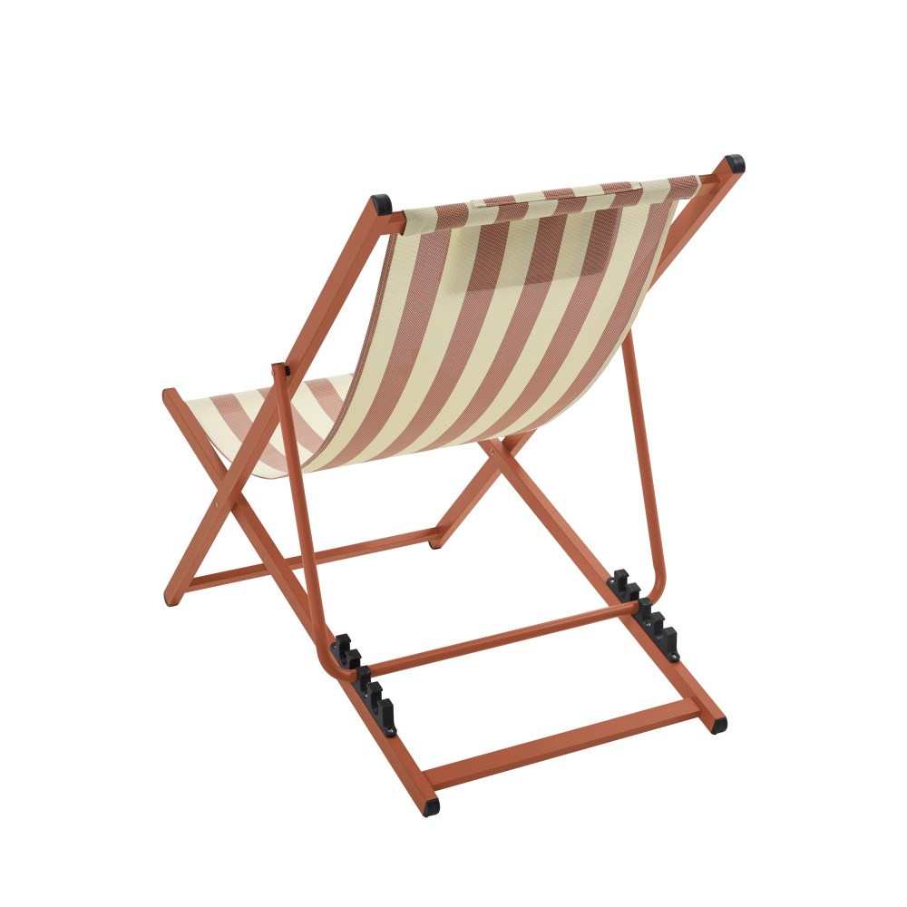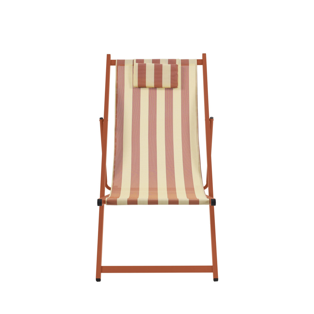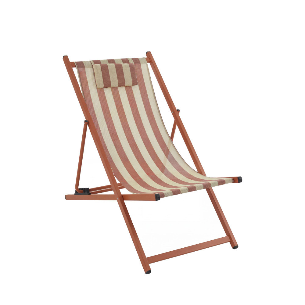 Leur silhouette légère associe une structure en aluminium avec revêtement poudre à une toile en textilène rayé (70 % PVC, 30 % polyester), résistante et facile à vivre. Le tissu épouse naturellement le corps tandis que le coussin de tête intégré, rembourré en mousse, invite à poser la nuque et à décrocher pour de bon. Grâce aux 4 positions réglables, vous passez d’une lecture bien droite à une sieste presque allongée en un geste. Et quand la journée se termine, elles se plient en un clin d’œil pour se ranger sans encombrer.